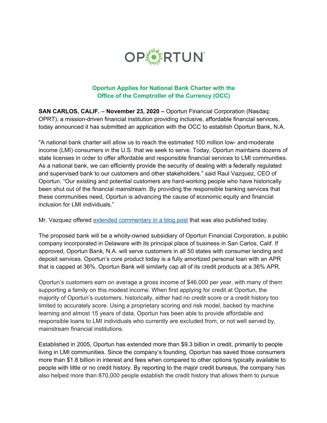 Oportun Applies for National Bank Charter with the Office of the Comptroller of the Currency (OCC) SAN CARLOS, CALIF. – November 23, 2020 – Oportun Financial Corporation (Nasdaq: OPRT), a mission-driven financial institution providing inclusive, affordable financial services, today announced it has submitted an application with the OCC to establish Oportun Bank, N.A. "A national bank charter will allow us to reach the estimated 100 million low- and-moderate income (LMI) consumers in the U.S. that we seek to serve. Today, Oportun maintains dozens of state licenses in order to offer affordable and responsible financial services to LMI communities. As a national bank, we can efficiently provide the security of dealing with a federally regulated and supervised bank to our customers and other stakeholders.” said Raul Vazquez, CEO of Oportun. “Our existing and potential customers are hard-working people who have historically been shut out of the financial mainstream. By providing the responsible banking services that these communities need, Oportun is advancing the cause of economic equity and financial inclusion for LMI individuals.” Mr. Vazquez offered extended commentary in a blog post that was also published today. The proposed bank will be a wholly-owned subsidiary of Oportun Financial Corporation, a public company incorporated in Delaware with its principal place of business in San Carlos, Calif. If approved, Oportun Bank, N.A. will serve customers in all 50 states with consumer lending and deposit services. Oportun’s core product today is a fully amortized personal loan with an APR that is capped at 36%. Oportun Bank will similarly cap all of its credit products at a 36% APR. Oportun’s customers earn on average a gross income of $46,000 per year, with many of them supporting a family on this modest income. When first applying for credit at Oportun, the majority of Oportun’s customers, historically, either had no credit score or a credit history too limited to accurately score. Using a proprietary scoring and risk model, backed by machine learning and almost 15 years of data, Oportun has been able to provide affordable and responsible loans to LMI individuals who currently are excluded from, or not well served by, mainstream financial institutions. Established in 2005, Oportun has extended more than $9.3 billion in credit, primarily to people living in LMI communities. Since the company’s founding, Oportun has saved those consumers more than $1.8 billion in interest and fees when compared to other options typically available to people with little or no credit history. By reporting to the major credit bureaus, the company has also helped more than 870,000 people establish the credit history that allows them to pursue