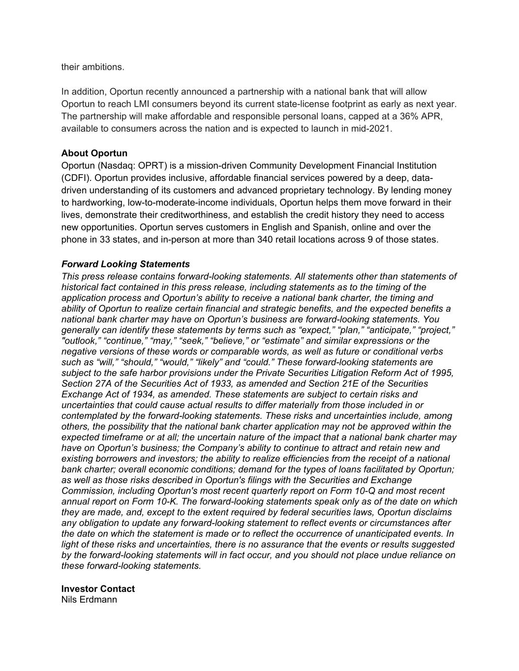 their ambitions. In addition, Oportun recently announced a partnership with a national bank that will allow Oportun to reach LMI consumers beyond its current state-license footprint as early as next year. The partnership will make affordable and responsible personal loans, capped at a 36% APR, available to consumers across the nation and is expected to launch in mid-2021. About Oportun Oportun (Nasdaq: OPRT) is a mission-driven Community Development Financial Institution (CDFI). Oportun provides inclusive, affordable financial services powered by a deep, data- driven understanding of its customers and advanced proprietary technology. By lending money to hardworking, low-to-moderate-income individuals, Oportun helps them move forward in their lives, demonstrate their creditworthiness, and establish the credit history they need to access new opportunities. Oportun serves customers in English and Spanish, online and over the phone in 33 states, and in-person at more than 340 retail locations across 9 of those states. Forward Looking Statements This press release contains forward-looking statements. All statements other than statements of historical fact contained in this press release, including statements as to the timing of the application process and Oportun’s ability to receive a national bank charter, the timing and ability of Oportun to realize certain financial and strategic benefits, and the expected benefits a national bank charter may have on Oportun’s business are forward-looking statements. You generally can identify these statements by terms such as “expect,” “plan,” “anticipate,” “project,” "outlook,” “continue,” “may,” “seek,” “believe,” or “estimate” and similar expressions or the negative versions of these words or comparable words, as well as future or conditional verbs such as “will,” “should,” “would,” “likely” and “could.” These forward-looking statements are subject to the safe harbor provisions under the Private Securities Litigation Reform Act of 1995, Section 27A of the Securities Act of 1933, as amended and Section 21E of the Securities Exchange Act of 1934, as amended. These statements are subject to certain risks and uncertainties that could cause actual results to differ materially from those included in or contemplated by the forward-looking statements. These risks and uncertainties include, among others, the possibility that the national bank charter application may not be approved within the expected timeframe or at all; the uncertain nature of the impact that a national bank charter may have on Oportun’s business; the Company’s ability to continue to attract and retain new and existing borrowers and investors; the ability to realize efficiencies from the receipt of a national bank charter; overall economic conditions; demand for the types of loans facilitated by Oportun; as well as those risks described in Oportun's filings with the Securities and Exchange Commission, including Oportun's most recent quarterly report on Form 10-Q and most recent annual report on Form 10-K. The forward-looking statements speak only as of the date on which they are made, and, except to the extent required by federal securities laws, Oportun disclaims any obligation to update any forward-looking statement to reflect events or circumstances after the date on which the statement is made or to reflect the occurrence of unanticipated events. In light of these risks and uncertainties, there is no assurance that the events or results suggested by the forward-looking statements will in fact occur, and you should not place undue reliance on these forward-looking statements. Investor Contact Nils Erdmann