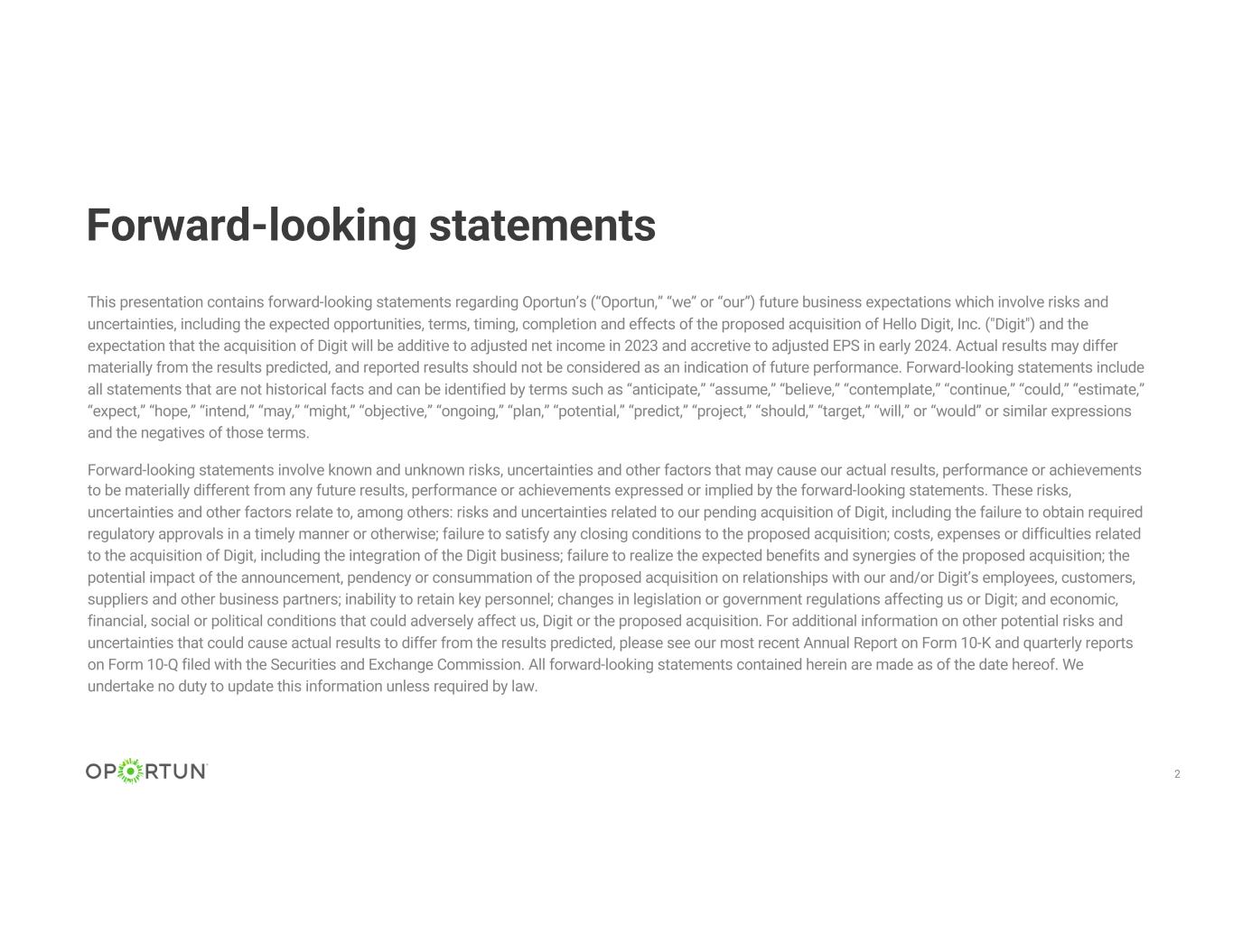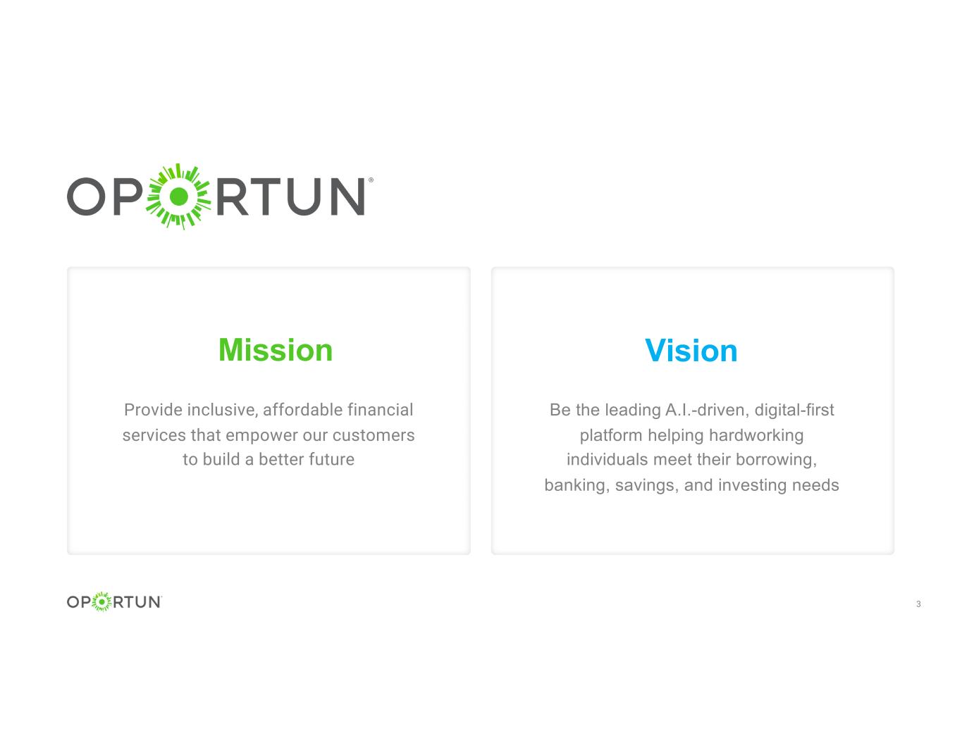 Forward-looking statements 2 This presentation contains forward-looking statements regarding Oportun’s (“Oportun,” “we” or “our”) future business expectations which involve risks and uncertainties, including the expected opportunities, terms, timing, completion and effects of the proposed acquisition of Hello Digit, Inc. ("Digit") and the expectation that the acquisition of Digit will be additive to adjusted net income in 2023 and accretive to adjusted EPS in early 2024. Actual results may differ materially from the results predicted, and reported results should not be considered as an indication of future performance. Forward-looking statements include all statements that are not historical facts and can be identified by terms such as “anticipate,” “assume,” “believe,” “contemplate,” “continue,” “could,” “estimate,” “expect,” “hope,” “intend,” “may,” “might,” “objective,” “ongoing,” “plan,” “potential,” “predict,” “project,” “should,” “target,” “will,” or “would” or similar expressions and the negatives of those terms. Forward-looking statements involve known and unknown risks, uncertainties and other factors that may cause our actual results, performance or achievements to be materially different from any future results, performance or achievements expressed or implied by the forward-looking statements. These risks, uncertainties and other factors relate to, among others: risks and uncertainties related to our pending acquisition of Digit, including the failure to obtain required regulatory approvals in a timely manner or otherwise; failure to satisfy any closing conditions to the proposed acquisition; costs, expenses or difficulties related to the acquisition of Digit, including the integration of the Digit business; failure to realize the expected benefits and synergies of the proposed acquisition; the potential impact of the announcement, pendency or consummation of the proposed acquisition on relationships with our and/or Digit’s employees, customers, suppliers and other business partners; inability to retain key personnel; changes in legislation or government regulations affecting us or Digit; and economic, financial, social or political conditions that could adversely affect us, Digit or the proposed acquisition. For additional information on other potential risks and uncertainties that could cause actual results to differ from the results predicted, please see our most recent Annual Report on Form 10-K and quarterly reports on Form 10-Q filed with the Securities and Exchange Commission. All forward-looking statements contained herein are made as of the date hereof. We undertake no duty to update this information unless required by law.