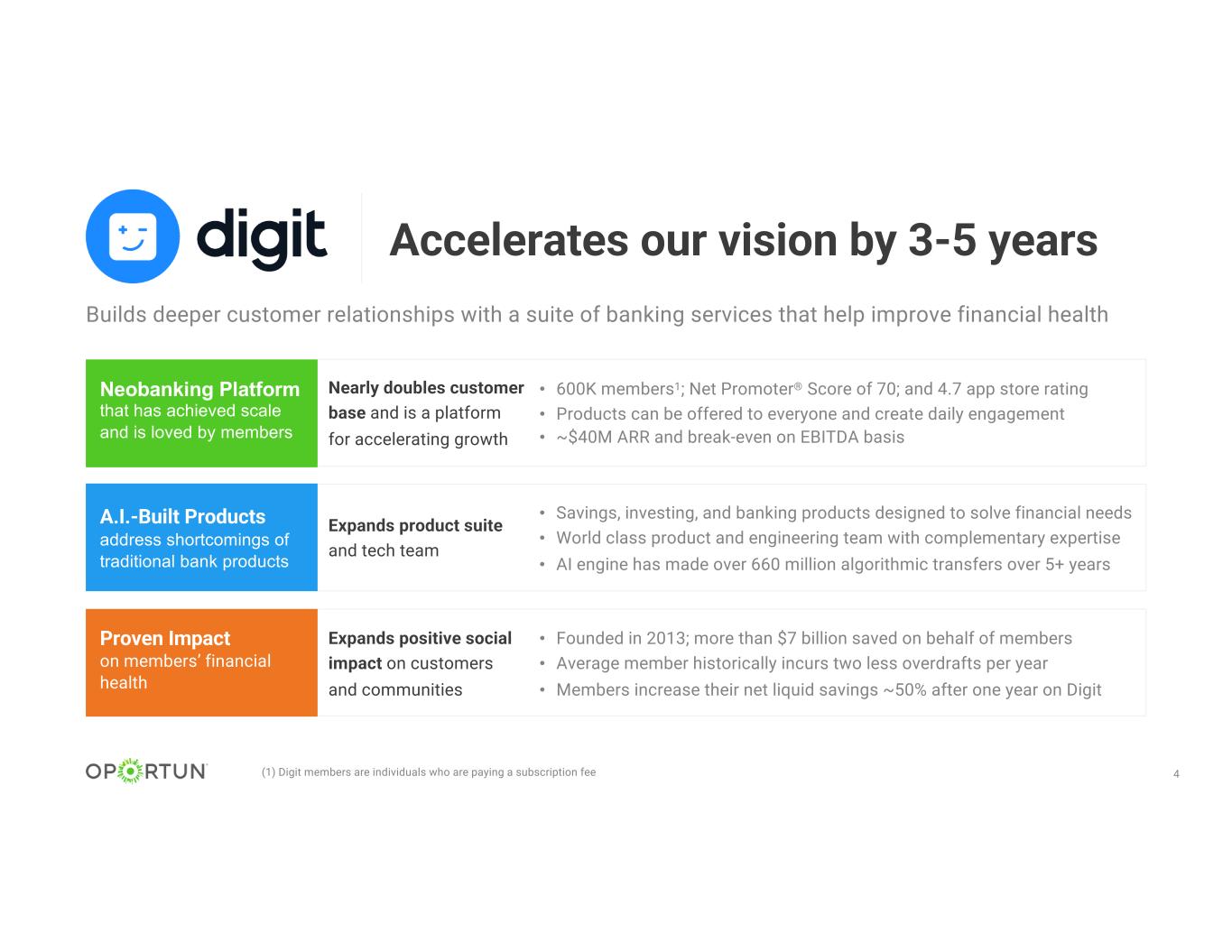 3 Mission Vision Provide inclusive, affordable financial services that empower our customers to build a better future Be the leading A.I.-driven, digital-first platform helping hardworking individuals meet their borrowing, banking, savings, and investing needs