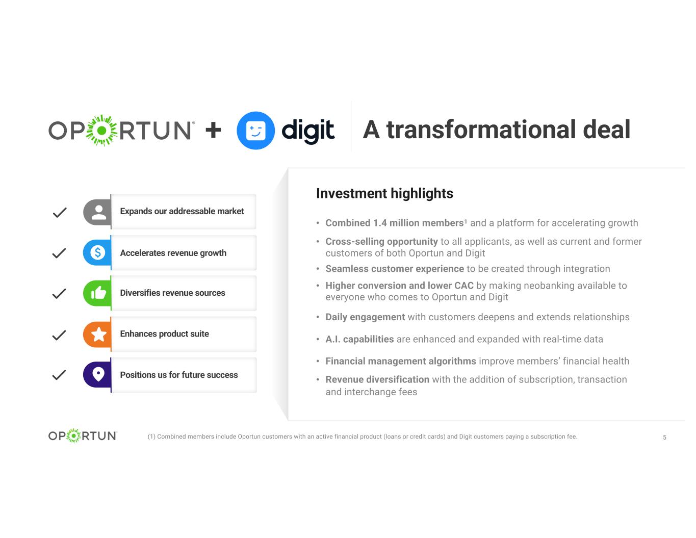 4 Nearly doubles customer base and is a platform for accelerating growth • Founded in 2013; more than $7 billion saved on behalf of members • Average member historically incurs two less overdrafts per year • Members increase their net liquid savings ~50% after one year on Digit • Savings, investing, and banking products designed to solve financial needs • World class product and engineering team with complementary expertise • AI engine has made over 660 million algorithmic transfers over 5+ years • 600K members1; Net Promoter® Score of 70; and 4.7 app store rating • Products can be offered to everyone and create daily engagement • ~$40M ARR and break-even on EBITDA basis Neobanking Platform that has achieved scale and is loved by members A.I.-Built Products address shortcomings of traditional bank products Expands product suite and tech team Expands positive social impact on customers and communities Proven Impact on members’ financial health Builds deeper customer relationships with a suite of banking services that help improve financial health (1) Digit members are individuals who are paying a subscription fee Accelerates our vision by 3-5 years