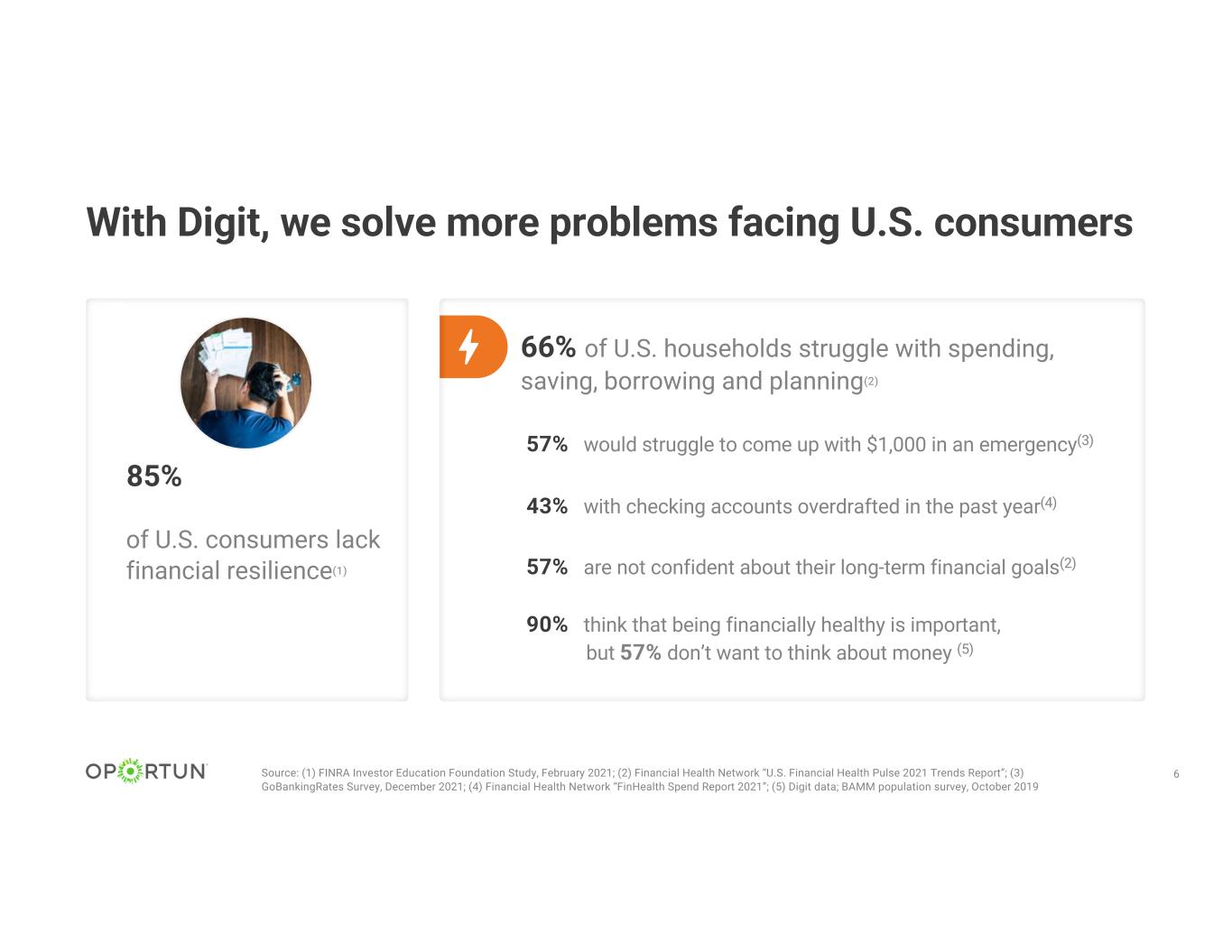 Accelerates revenue growth Diversifies revenue sources Positions us for future success Enhances product suite Expands our addressable market Investment highlights • Combined 1.4 million members1 and a platform for accelerating growth • Cross-selling opportunity to all applicants, as well as current and former customers of both Oportun and Digit • Seamless customer experience to be created through integration • Higher conversion and lower CAC by making neobanking available to everyone who comes to Oportun and Digit • Daily engagement with customers deepens and extends relationships • A.I. capabilities are enhanced and expanded with real-time data • Financial management algorithms improve members’ financial health • Revenue diversification with the addition of subscription, transaction and interchange fees 5(1) Combined members include Oportun customers with an active financial product (loans or credit cards) and Digit customers paying a subscription fee. A transformational deal+