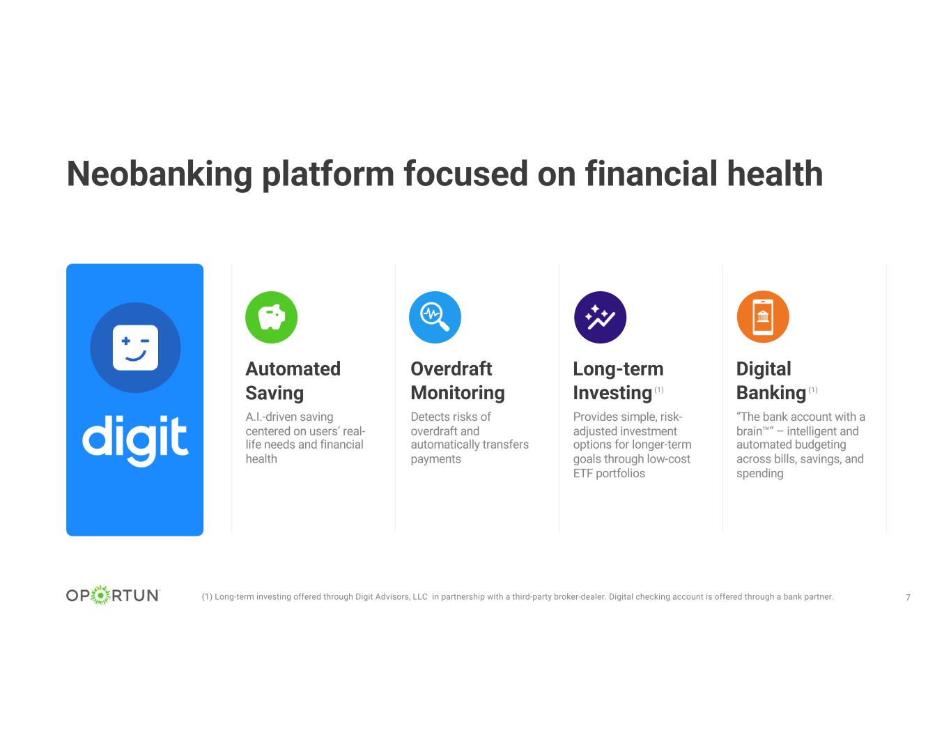 6 With Digit, we solve more problems facing U.S. consumers Source: (1) FINRA Investor Education Foundation Study, February 2021; (2) Financial Health Network “U.S. Financial Health Pulse 2021 Trends Report”; (3) GoBankingRates Survey, December 2021; (4) Financial Health Network “FinHealth Spend Report 2021”; (5) Digit data; BAMM population survey, October 2019 85% of U.S. consumers lack financial resilience(1) 57% would struggle to come up with $1,000 in an emergency(3) 43% with checking accounts overdrafted in the past year(4) 57% are not confident about their long-term financial goals(2) 90% think that being financially healthy is important, but 57% don’t want to think about money (5) 66% of U.S. households struggle with spending, saving, borrowing and planning(2)