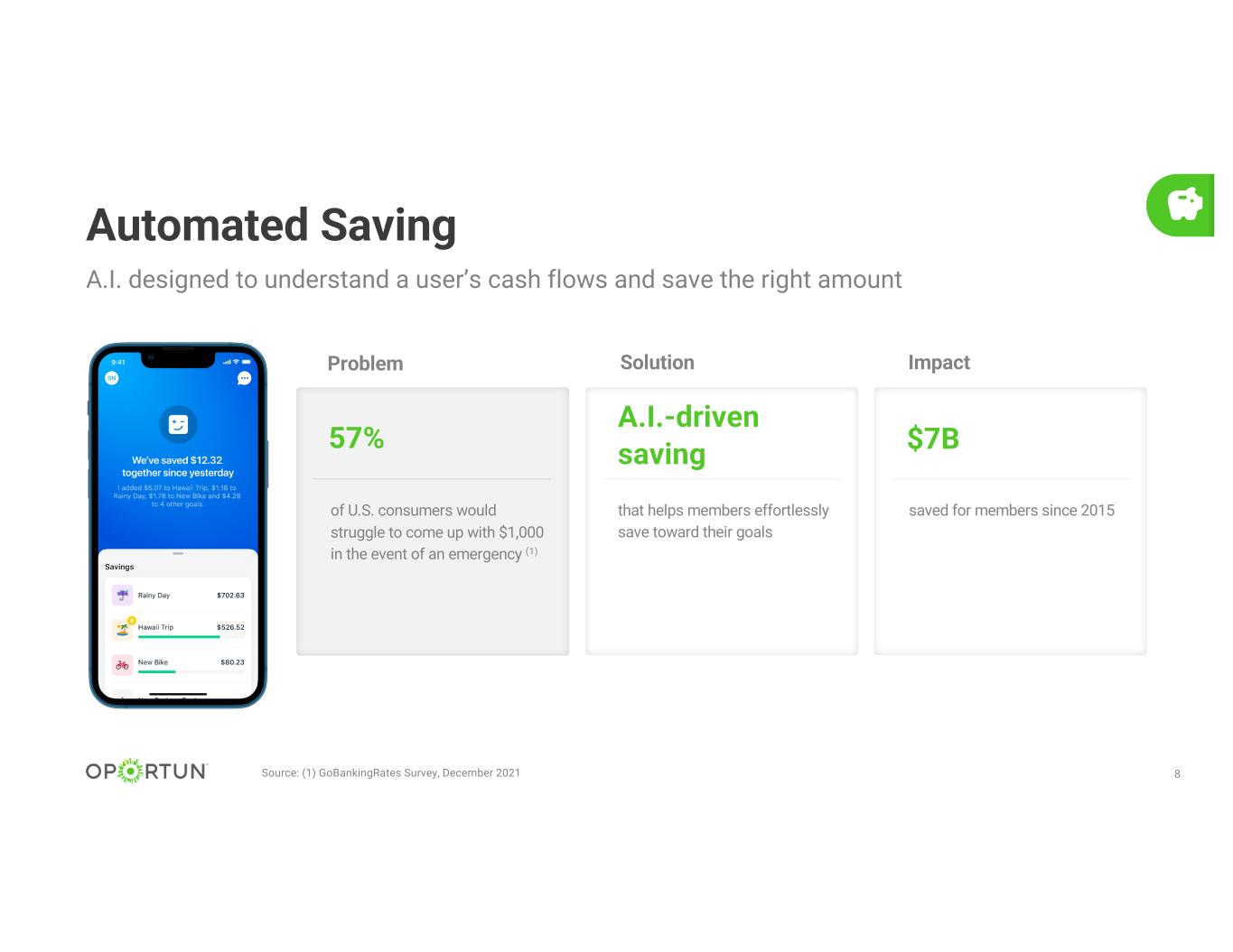 7 Neobanking platform focused on financial health Provides simple, risk- adjusted investment options for longer-term goals through low-cost ETF portfolios “The bank account with a brain™” – intelligent and automated budgeting across bills, savings, and spending Detects risks of overdraft and automatically transfers payments A.I.-driven saving centered on users’ real- life needs and financial health Long-term Investing (1) Digital Banking (1) Overdraft Monitoring Automated Saving (1) Long-term investing offered through Digit Advisors, LLC in partnership with a third-party broker-dealer. Digital checking account is offered through a bank partner.