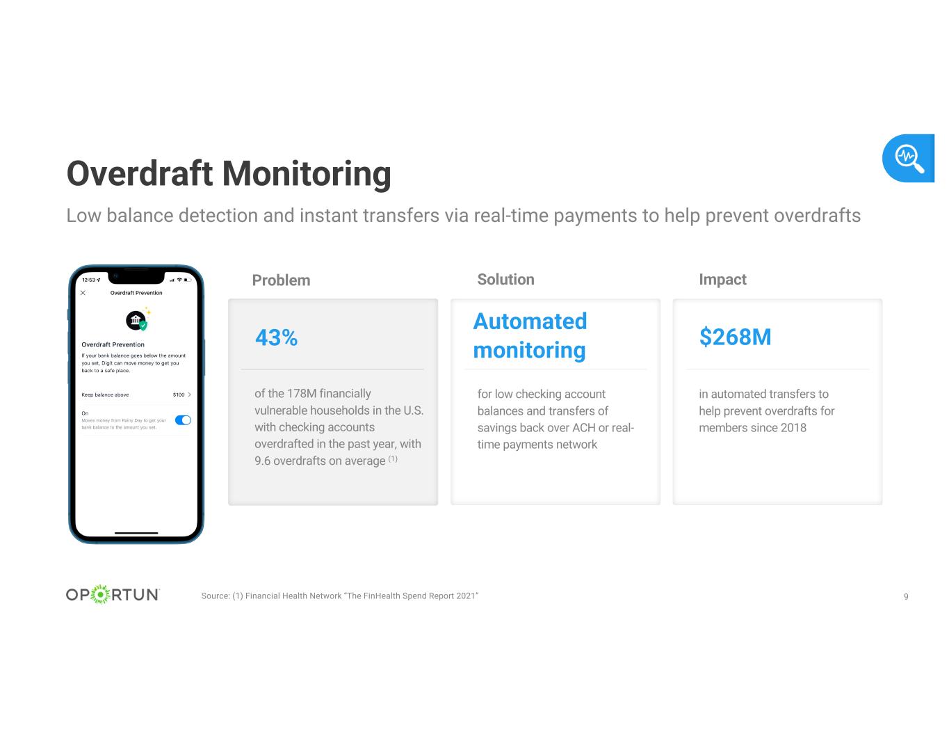 8 Automated Saving A.I. designed to understand a user’s cash flows and save the right amount Source: (1) GoBankingRates Survey, December 2021 57% saved for members since 2015 $7B that helps members effortlessly save toward their goals A.I.-driven saving of U.S. consumers would struggle to come up with $1,000 in the event of an emergency (1) ImpactSolutionProblem