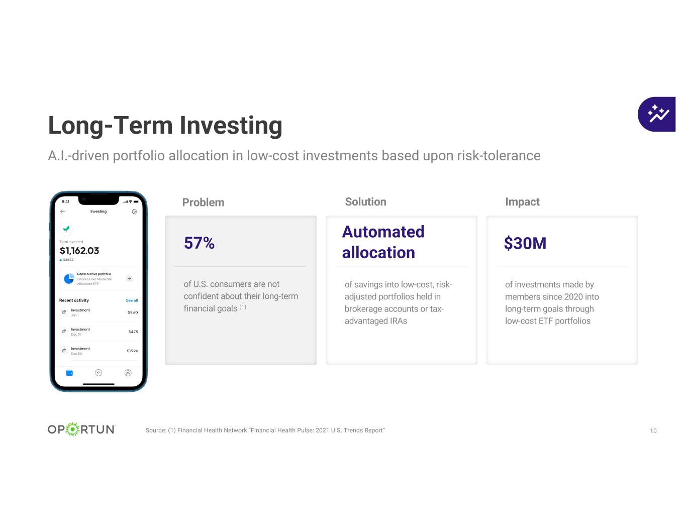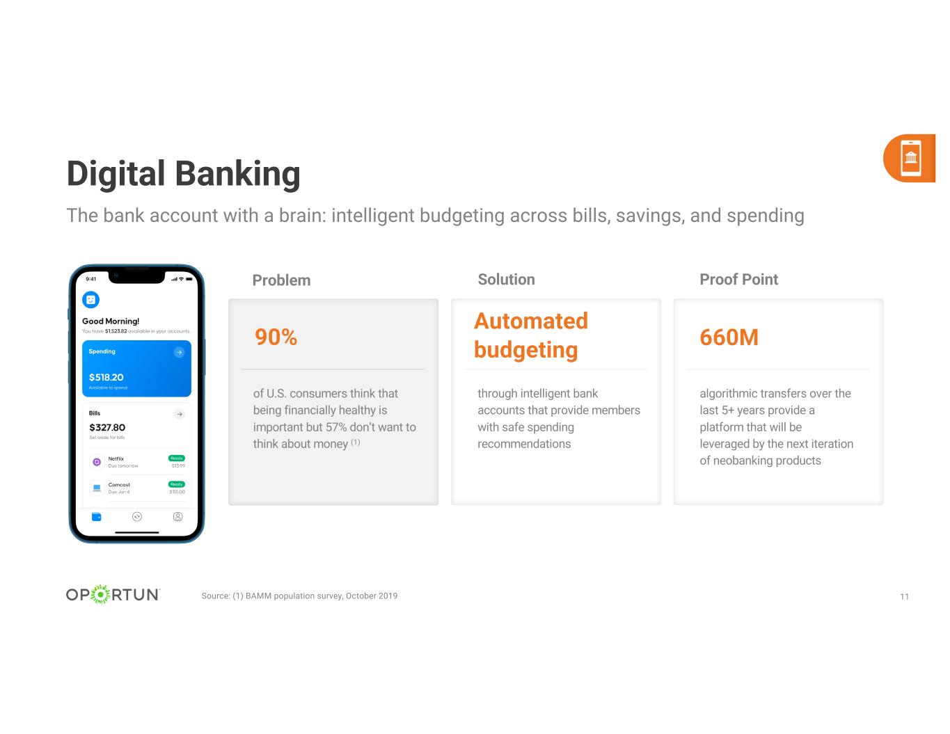 10 Long-Term Investing 57% $30M Automated allocation of savings into low-cost, risk- adjusted portfolios held in brokerage accounts or tax- advantaged IRAs of U.S. consumers are not confident about their long-term financial goals (1) of investments made by members since 2020 into long-term goals through low-cost ETF portfolios A.I.-driven portfolio allocation in low-cost investments based upon risk-tolerance Source: (1) Financial Health Network “Financial Health Pulse: 2021 U.S. Trends Report” ImpactSolutionProblem