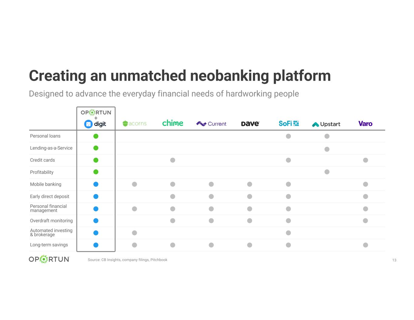 12 Most comprehensive set of financial products Combines profitable lending platform with effortless savings, investing, and banking products Vision An A.I.-driven, digital-first platform delighting customers daily when they need to: Borrow Save Invest Bank Personal Loans Secured Personal Loans Credit Cards Long-Term Investing Digital Banking Automated Saving Overdraft Monitoring +