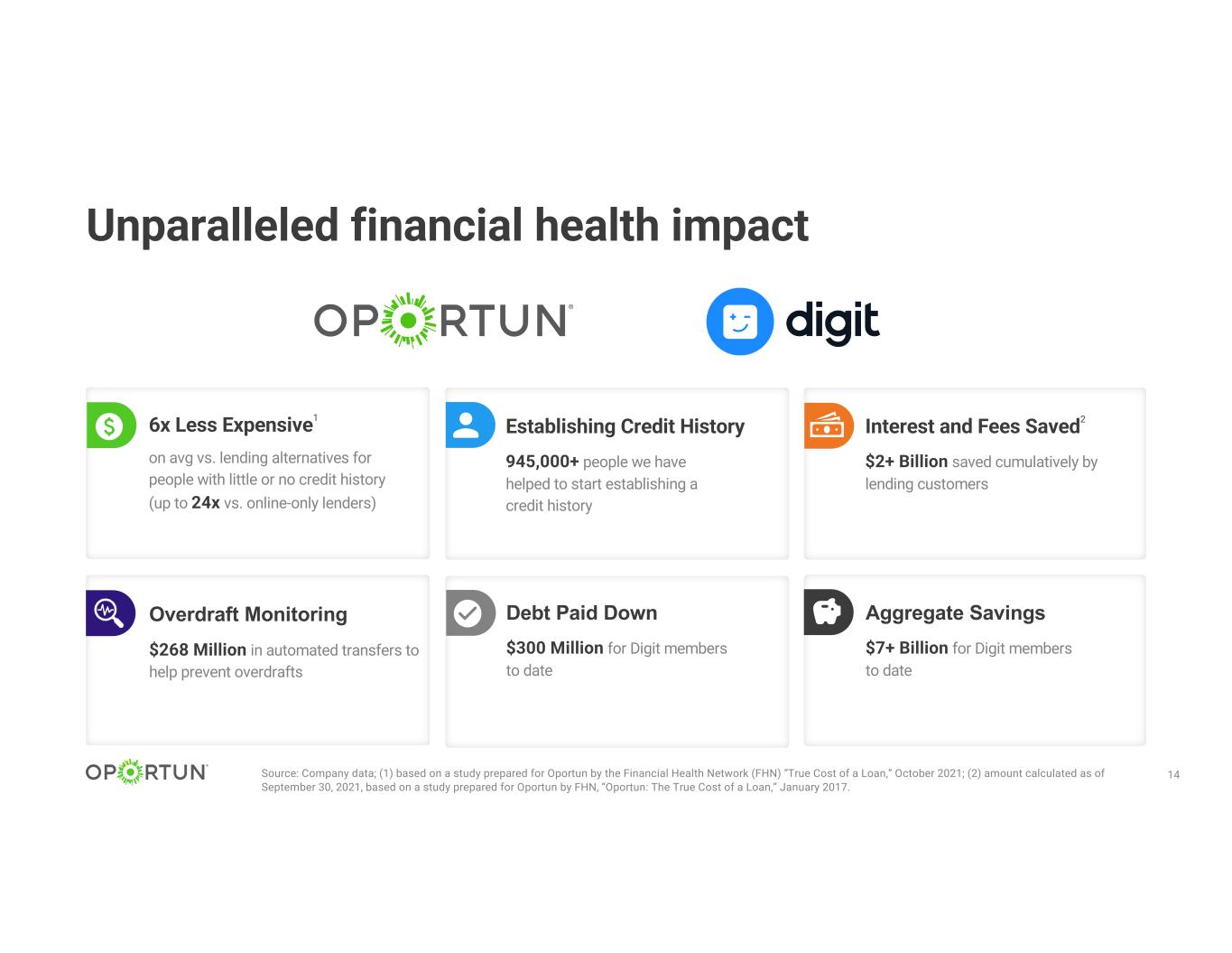 Designed to advance the everyday financial needs of hardworking people Creating an unmatched neobanking platform Personal loans Lending-as-a-Service Credit cards Profitability Mobile banking Early direct deposit Personal financial management Overdraft monitoring Automated investing & brokerage Long-term savings Source: CB Insights, company filings, Pitchbook + 13