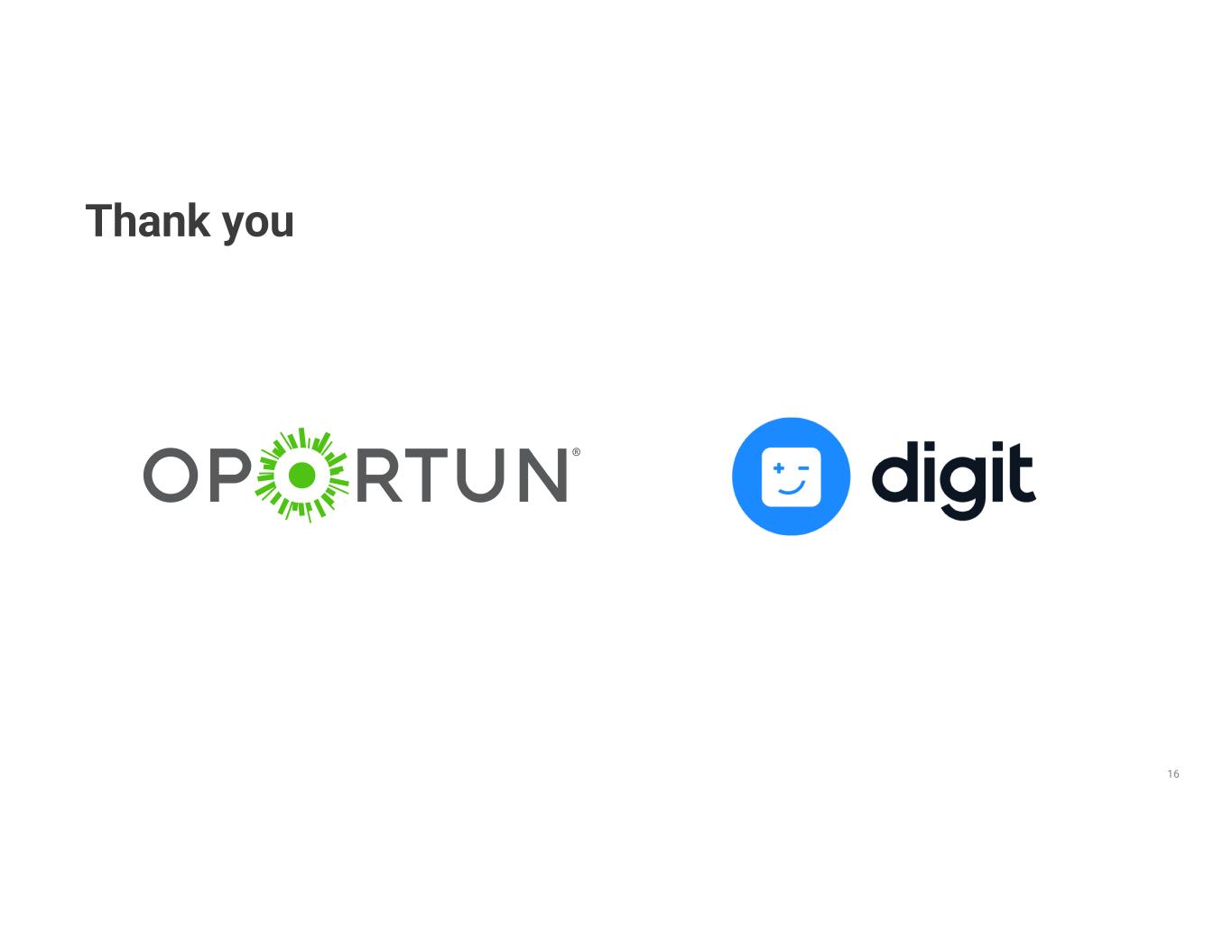 15 Transaction details Expected close late Q4’21 or early Q1’22 Size $212.9M enterprise value • Total consideration, $114.4M cash and $98.5M equity, subject to customary closing adjustments Financing $116M committed • Cash consideration will be financed through an amortizing loan secured by Oportun's securitization residual cash flows Integration Maintaining the Digit Brand • Digit to operate as an integrated business unit of Oportun with Ethan Bloch, Digit CEO, reporting directly to Raul Vazquez • ~100 Digit employees will continue their functions under Ethan Bloch Financial Impact Adj. Net Income contribution expected in ‘23 • Adj. EPS anticipated to be accretive in early ‘24