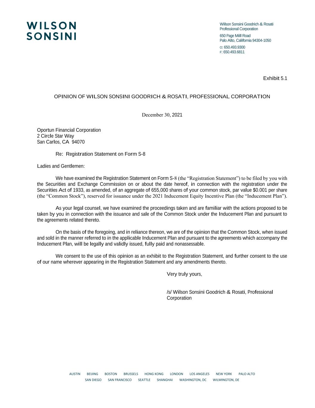 Wilson Sonsini Goodrich & Rosati Professional Corporation 650 Page Mill Road Palo Alto, California 94304-1050 O: 650.493.9300 F: 650.493.6811 AUSTIN BEIJING BOSTON BRUSSELS HONG KONG LONDON LOS ANGELES NEW YORK PALO ALTO SAN DIEGO SAN FRANCISCO SEATTLE SHANGHAI WASHINGTON, DC WILMINGTON, DE Exhibit 5.1 OPINION OF WILSON SONSINI GOODRICH & ROSATI, PROFESSIONAL CORPORATION December 30, 2021 Oportun Financial Corporation 2 Circle Star Way San Carlos, CA 94070 Re: Registration Statement on Form S-8 Ladies and Gentlemen: We have examined the Registration Statement on Form S-8 (the “Registration Statement”) to be filed by you with the Securities and Exchange Commission on or about the date hereof, in connection with the registration under the Securities Act of 1933, as amended, of an aggregate of 655,000 shares of your common stock, par value $0.001 per share (the “Common Stock”), reserved for issuance under the 2021 Inducement Equity Incentive Plan (the “Inducement Plan”). As your legal counsel, we have examined the proceedings taken and are familiar with the actions proposed to be taken by you in connection with the issuance and sale of the Common Stock under the Inducement Plan and pursuant to the agreements related thereto. On the basis of the foregoing, and in reliance thereon, we are of the opinion that the Common Stock, when issued and sold in the manner referred to in the applicable Inducement Plan and pursuant to the agreements which accompany the Inducement Plan, will be legally and validly issued, fully paid and nonassessable. We consent to the use of this opinion as an exhibit to the Registration Statement, and further consent to the use of our name wherever appearing in the Registration Statement and any amendments thereto. Very truly yours, /s/ Wilson Sonsini Goodrich & Rosati, Professional Corporation