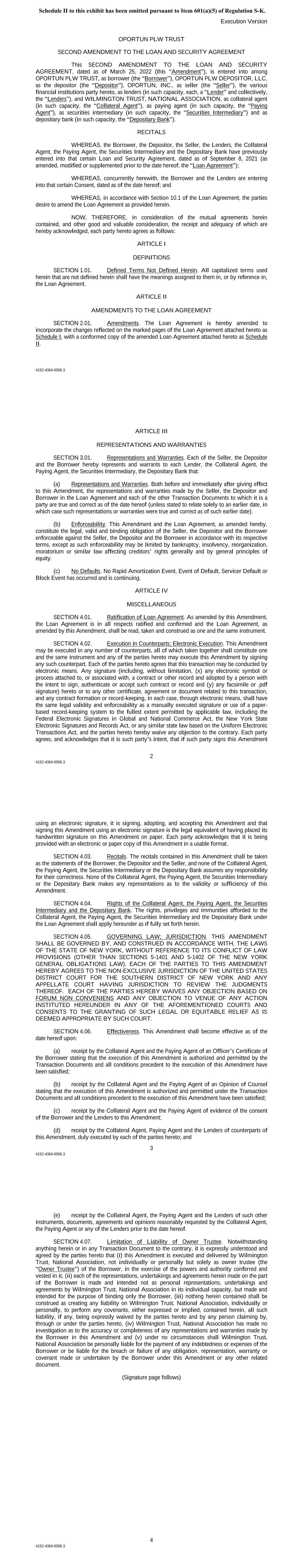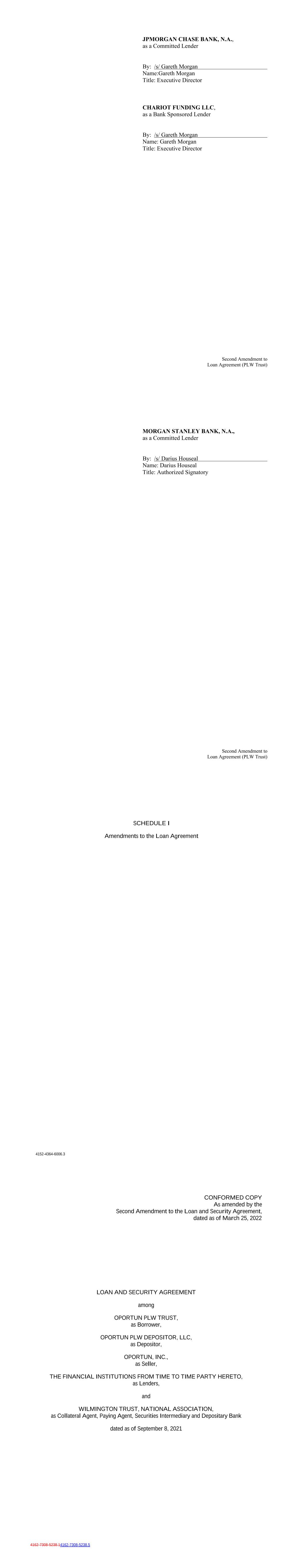 Second Amendment to Loan Agreement (PLW Trust) JPMORGAN CHASE BANK, N.A., as a Committed Lender By: /s/ Gareth Morgan Name:Gareth Morgan Title: Executive Director CHARIOT FUNDING LLC, as a Bank Sponsored Lender By: /s/ Gareth Morgan Name: Gareth Morgan Title: Executive Director Second Amendment to Loan Agreement (PLW Trust) MORGAN STANLEY BANK, N.A., as a Committed Lender By: /s/ Darius Houseal Name: Darius Houseal Title: Authorized Signatory 4152-4364-6006.3 SCHEDULE I Amendments to the Loan Agreement CONFORMED COPY As amended by the Second Amendment to the Loan and Security Agreement, dated as of March 25, 2022 4162-7308-5238.14162-7308-5238.5 LOAN AND SECURITY AGREEMENT among OPORTUN PLW TRUST, as Borrower, OPORTUN PLW DEPOSITOR, LLC, as Depositor, OPORTUN, INC., as Seller, THE FINANCIAL INSTITUTIONS FROM TIME TO TIME PARTY HERETO, as Lenders, and WILMINGTON TRUST, NATIONAL ASSOCIATION, as Collateral Agent, Paying Agent, Securities Intermediary and Depositary Bank dated as of September 8, 2021