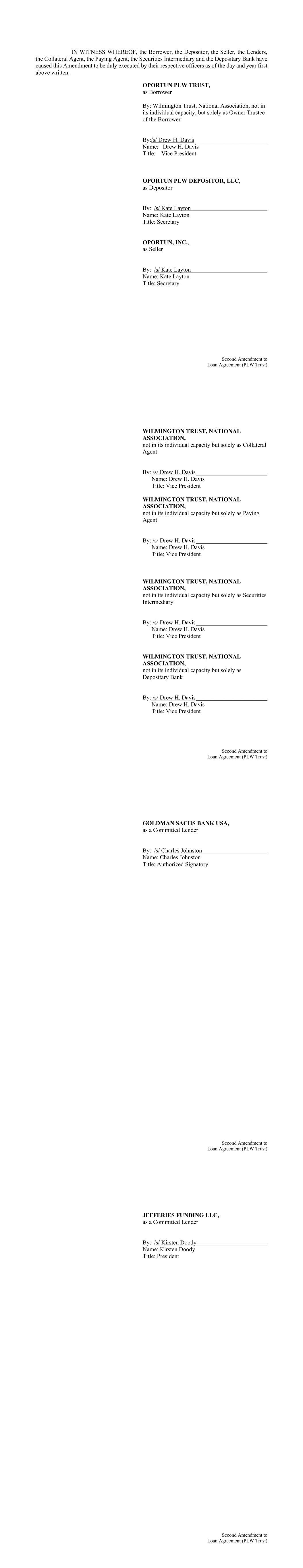 Second Amendment to Loan Agreement (PLW Trust) IN WITNESS WHEREOF, the Borrower, the Depositor, the Seller, the Lenders, the Collateral Agent, the Paying Agent, the Securities Intermediary and the Depositary Bank have caused this Amendment to be duly executed by their respective officers as of the day and year first above written. OPORTUN PLW TRUST, as Borrower By: Wilmington Trust, National Association, not in its individual capacity, but solely as Owner Trustee of the Borrower By:/s/ Drew H. Davis ________________________ Name: Drew H. Davis Title: Vice President OPORTUN PLW DEPOSITOR, LLC, as Depositor By: /s/ Kate Layton Name: Kate Layton Title: Secretary OPORTUN, INC., as Seller By: /s/ Kate Layton Name: Kate Layton Title: Secretary Second Amendment to Loan Agreement (PLW Trust) WILMINGTON TRUST, NATIONAL ASSOCIATION, not in its individual capacity but solely as Collateral Agent By: /s/ Drew H. Davis ________________________ Name: Drew H. Davis Title: Vice President WILMINGTON TRUST, NATIONAL ASSOCIATION, not in its individual capacity but solely as Paying Agent By: /s/ Drew H. Davis ________________________ Name: Drew H. Davis Title: Vice President WILMINGTON TRUST, NATIONAL ASSOCIATION, not in its individual capacity but solely as Securities Intermediary By: /s/ Drew H. Davis ________________________ Name: Drew H. Davis Title: Vice President WILMINGTON TRUST, NATIONAL ASSOCIATION, not in its individual capacity but solely as Depositary Bank By: /s/ Drew H. Davis ________________________ Name: Drew H. Davis Title: Vice President Second Amendment to Loan Agreement (PLW Trust) GOLDMAN SACHS BANK USA, as a Committed Lender By: /s/ Charles Johnston Name: Charles Johnston Title: Authorized Signatory Second Amendment to Loan Agreement (PLW Trust) JEFFERIES FUNDING LLC, as a Committed Lender By: /s/ Kirsten Doody Name: Kirsten Doody Title: President