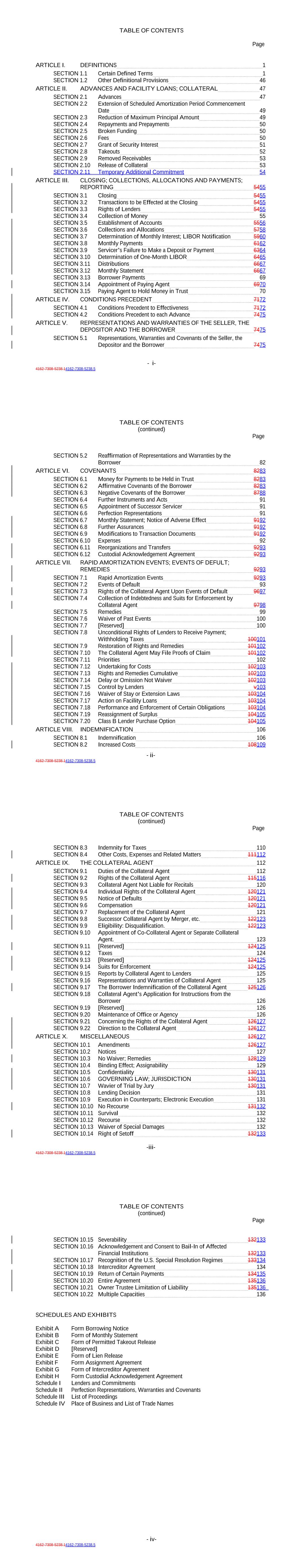 TABLE OF CONTENTS Page - i- 4162-7308-5238.14162-7308-5238.5 ARTICLE I. DEFINITIONS 1 SECTION 1.1 Certain Defined Terms 1 SECTION 1.2 Other Definitional Provisions 46 ARTICLE II. ADVANCES AND FACILITY LOANS; COLLATERAL 47 SECTION 2.1 Advances 47 SECTION 2.2 Extension of Scheduled Amortization Period Commencement Date 49 SECTION 2.3 Reduction of Maximum Principal Amount 49 SECTION 2.4 Repayments and Prepayments 50 SECTION 2.5 Broken Funding 50 SECTION 2.6 Fees 50 SECTION 2.7 Grant of Security Interest 51 SECTION 2.8 Takeouts 52 SECTION 2.9 Removed Receivables 53 SECTION 2.10 Release of Collateral 53 SECTION 2.11 Temporary Additional Commitment 54 ARTICLE III. CLOSING; COLLECTIONS, ALLOCATIONS AND PAYMENTS; REPORTING 5455 SECTION 3.1 Closing 5455 SECTION 3.2 Transactions to be Effected at the Closing 5455 SECTION 3.3 Rights of Lenders 5455 SECTION 3.4 Collection of Money 55 SECTION 3.5 Establishment of Accounts 5556 SECTION 3.6 Collections and Allocations 5758 SECTION 3.7 Determination of Monthly Interest; LIBOR Notification 5960 SECTION 3.8 Monthly Payments 6162 SECTION 3.9 Servicer’s Failure to Make a Deposit or Payment 6364 SECTION 3.10 Determination of One-Month LIBOR 6465 SECTION 3.11 Distributions 6667 SECTION 3.12 Monthly Statement 6667 SECTION 3.13 Borrower Payments 69 SECTION 3.14 Appointment of Paying Agent 6970 SECTION 3.15 Paying Agent to Hold Money in Trust 70 ARTICLE IV. CONDITIONS PRECEDENT 7172 SECTION 4.1 Conditions Precedent to Effectiveness 7172 SECTION 4.2 Conditions Precedent to each Advance 7475 ARTICLE V. REPRESENTATIONS AND WARRANTIES OF THE SELLER, THE DEPOSITOR AND THE BORROWER 7475 SECTION 5.1 Representations, Warranties and Covenants of the Seller, the Depositor and the Borrower 7475 TABLE OF CONTENTS (continued) Page - ii- 4162-7308-5238.14162-7308-5238.5 SECTION 5.2 Reaffirmation of Representations and Warranties by the Borrower 82 ARTICLE VI. COVENANTS 8283 SECTION 6.1 Money for Payments to be Held in Trust 8283 SECTION 6.2 Affirmative Covenants of the Borrower 8283 SECTION 6.3 Negative Covenants of the Borrower 8788 SECTION 6.4 Further Instruments and Acts 91 SECTION 6.5 Appointment of Successor Servicer 91 SECTION 6.6 Perfection Representations 91 SECTION 6.7 Monthly Statement; Notice of Adverse Effect 9192 SECTION 6.8 Further Assurances 9192 SECTION 6.9 Modifications to Transaction Documents 9192 SECTION 6.10 Expenses 92 SECTION 6.11 Reorganizations and Transfers 9293 SECTION 6.12 Custodial Acknowledgement Agreement 9293 ARTICLE VII. RAPID AMORTIZATION EVENTS; EVENTS OF DEFULT; REMEDIES 9293 SECTION 7.1 Rapid Amortization Events 9293 SECTION 7.2 Events of Default 93 SECTION 7.3 Rights of the Collateral Agent Upon Events of Default 9697 SECTION 7.4 Collection of Indebtedness and Suits for Enforcement by Collateral Agent 9798 SECTION 7.5 Remedies 99 SECTION 7.6 Waiver of Past Events 100 SECTION 7.7 [Reserved] 100 SECTION 7.8 Unconditional Rights of Lenders to Receive Payment; Withholding Taxes 100101 SECTION 7.9 Restoration of Rights and Remedies 101102 SECTION 7.10 The Collateral Agent May File Proofs of Claim 101102 SECTION 7.11 Priorities 102 SECTION 7.12 Undertaking for Costs 102103 SECTION 7.13 Rights and Remedies Cumulative 102103 SECTION 7.14 Delay or Omission Not Waiver 102103 SECTION 7.15 Control by Lenders v103 SECTION 7.16 Waiver of Stay or Extension Laws 103104 SECTION 7.17 Action on Facility Loans 103104 SECTION 7.18 Performance and Enforcement of Certain Obligations 103104 SECTION 7.19 Reassignment of Surplus 104105 SECTION 7.20 Class B Lender Purchase Option 104105 ARTICLE VIII. INDEMNIFICATION 106 SECTION 8.1 Indemnification 106 SECTION 8.2 Increased Costs 108109 TABLE OF CONTENTS (continued) Page -iii- 4162-7308-5238.14162-7308-5238.5 SECTION 8.3 Indemnity for Taxes 110 SECTION 8.4 Other Costs, Expenses and Related Matters 111112 ARTICLE IX. THE COLLATERAL AGENT 112 SECTION 9.1 Duties of the Collateral Agent 112 SECTION 9.2 Rights of the Collateral Agent 115116 SECTION 9.3 Collateral Agent Not Liable for Recitals 120 SECTION 9.4 Individual Rights of the Collateral Agent 120121 SECTION 9.5 Notice of Defaults 120121 SECTION 9.6 Compensation 120121 SECTION 9.7 Replacement of the Collateral Agent 121 SECTION 9.8 Successor Collateral Agent by Merger, etc. 122123 SECTION 9.9 Eligibility: Disqualification. 122123 SECTION 9.10 Appointment of Co-Collateral Agent or Separate Collateral Agent. 123 SECTION 9.11 [Reserved] 124125 SECTION 9.12 Taxes 124 SECTION 9.13 [Reserved] 124125 SECTION 9.14 Suits for Enforcement 124125 SECTION 9.15 Reports by Collateral Agent to Lenders 125 SECTION 9.16 Representations and Warranties of Collateral Agent 125 SECTION 9.17 The Borrower Indemnification of the Collateral Agent 125126 SECTION 9.18 Collateral Agent’s Application for Instructions from the Borrower 126 SECTION 9.19 [Reserved] 126 SECTION 9.20 Maintenance of Office or Agency 126 SECTION 9.21 Concerning the Rights of the Collateral Agent 126127 SECTION 9.22 Direction to the Collateral Agent 126127 ARTICLE X. MISCELLANEOUS 126127 SECTION 10.1 Amendments 126127 SECTION 10.2 Notices 127 SECTION 10.3 No Waiver; Remedies 128129 SECTION 10.4 Binding Effect; Assignability 129 SECTION 10.5 Confidentiality 130131 SECTION 10.6 GOVERNING LAW; JURISDICTION 130131 SECTION 10.7 Wavier of Trial by Jury 130131 SECTION 10.8 Lending Decision 131 SECTION 10.9 Execution in Counterparts; Electronic Execution 131 SECTION 10.10 No Recourse 131132 SECTION 10.11 Survival 132 SECTION 10.12 Recourse 132 SECTION 10.13 Waiver of Special Damages 132 SECTION 10.14 Right of Setoff 132133 TABLE OF CONTENTS (continued) Page - iv- 4162-7308-5238.14162-7308-5238.5 SECTION 10.15 Severability 132133 SECTION 10.16 Acknowledgement and Consent to Bail-In of Affected Financial Institutions 132133 SECTION 10.17 Recognition of the U.S. Special Resolution Regimes 133134 SECTION 10.18 Intercreditor Agreement 134 SECTION 10.19 Return of Certain Payments 134135 SECTION 10.20 Entire Agreement 135136 SECT