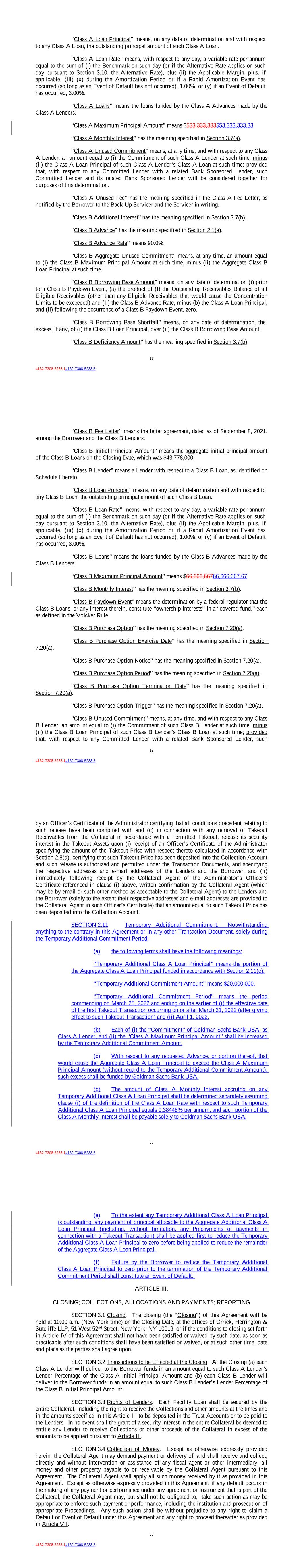 11 4162-7308-5238.14162-7308-5238.5 “Class A Loan Principal” means, on any date of determination and with respect to any Class A Loan, the outstanding principal amount of such Class A Loan. “Class A Loan Rate” means, with respect to any day, a variable rate per annum equal to the sum of (i) the Benchmark on such day (or if the Alternative Rate applies on such day pursuant to Section 3.10, the Alternative Rate), plus (ii) the Applicable Margin, plus, if applicable, (iii) (x) during the Amortization Period or if a Rapid Amortization Event has occurred (so long as an Event of Default has not occurred), 1.00%, or (y) if an Event of Default has occurred, 3.00%. “Class A Loans” means the loans funded by the Class A Advances made by the Class A Lenders. “Class A Maximum Principal Amount” means $533,333,333553,333,333.33. “Class A Monthly Interest” has the meaning specified in Section 3.7(a). “Class A Unused Commitment” means, at any time, and with respect to any Class A Lender, an amount equal to (i) the Commitment of such Class A Lender at such time, minus (ii) the Class A Loan Principal of such Class A Lender’s Class A Loan at such time; provided that, with respect to any Committed Lender with a related Bank Sponsored Lender, such Committed Lender and its related Bank Sponsored Lender will be considered together for purposes of this determination. “Class A Unused Fee” has the meaning specified in the Class A Fee Letter, as notified by the Borrower to the Back-Up Servicer and the Servicer in writing. “Class B Additional Interest” has the meaning specified in Section 3.7(b). “Class B Advance” has the meaning specified in Section 2.1(a). “Class B Advance Rate” means 90.0%. “Class B Aggregate Unused Commitment” means, at any time, an amount equal to (i) the Class B Maximum Principal Amount at such time, minus (ii) the Aggregate Class B Loan Principal at such time. “Class B Borrowing Base Amount” means, on any date of determination (i) prior to a Class B Paydown Event, (a) the product of (I) the Outstanding Receivables Balance of all Eligible Receivables (other than any Eligible Receivables that would cause the Concentration Limits to be exceeded) and (II) the Class B Advance Rate, minus (b) the Class A Loan Principal, and (ii) following the occurrence of a Class B Paydown Event, zero. “Class B Borrowing Base Shortfall” means, on any date of determination, the excess, if any, of (i) the Class B Loan Principal, over (ii) the Class B Borrowing Base Amount. “Class B Deficiency Amount” has the meaning specified in Section 3.7(b). 12 4162-7308-5238.14162-7308-5238.5 “Class B Fee Letter” means the letter agreement, dated as of September 8, 2021, among the Borrower and the Class B Lenders. “Class B Initial Principal Amount” means the aggregate initial principal amount of the Class B Loans on the Closing Date, which was $43,778,000. “Class B Lender” means a Lender with respect to a Class B Loan, as identified on Schedule I hereto. “Class B Loan Principal” means, on any date of determination and with respect to any Class B Loan, the outstanding principal amount of such Class B Loan. “Class B Loan Rate” means, with respect to any day, a variable rate per annum equal to the sum of (i) the Benchmark on such day (or if the Alternative Rate applies on such day pursuant to Section 3.10, the Alternative Rate), plus (ii) the Applicable Margin, plus, if applicable, (iii) (x) during the Amortization Period or if a Rapid Amortization Event has occurred (so long as an Event of Default has not occurred), 1.00%, or (y) if an Event of Default has occurred, 3.00%. “Class B Loans” means the loans funded by the Class B Advances made by the Class B Lenders. “Class B Maximum Principal Amount” means $66,666,66766,666,667.67. “Class B Monthly Interest” has the meaning specified in Section 3.7(b). “Class B Paydown Event” means the determination by a federal regulator that the Class B Loans, or any interest therein, constitute “ownership interests” in a “covered fund,” each as defined in the Volcker Rule. “Class B Purchase Option” has the meaning specified in Section 7.20(a). “Class B Purchase Option Exercise Date” has the meaning specified in Section 7.20(a). “Class B Purchase Option Notice” has the meaning specified in Section 7.20(a). “Class B Purchase Option Period” has the meaning specified in Section 7.20(a). “Class B Purchase Option Termination Date” has the meaning specified in Section 7.20(a). “Class B Purchase Option Trigger” has the meaning specified in Section 7.20(a). “Class B Unused Commitment” means, at any time, and with respect to any Class B Lender, an amount equal to (i) the Commitment of such Class B Lender at such time, minus (ii) the Class B Loan Principal of such Class B Lender’s Class B Loan at such time; provided that, with respect to any Committed Lender with a related Bank Sponsored Lender, such 55 4162-7308-5238.14162-7308-5238.5 by an Officer’s Certificate of the Administrator certifying that all conditions precedent relating to such release have been complied with and (c) in connection with any removal of Takeout Receivables from the Collateral in accordance with a Permitted Takeout, release its security interest in the Takeout Assets upon (i) receipt of an Officer’s Certificate of the Administrator specifying the amount of the Takeout Price with respect thereto calculated in accordance with Section 2.8(d), certifying that such Takeout Price has been deposited into the Collection Account and such release is authorized and permitted under the Transaction Documents, and specifying the respective addresses and e-mail addresses of the Lenders and the Borrower, and (ii) immediately following receipt by the Collateral Agent of the Administrator’s Officer’s Certificate referenced in clause (i) above, written confirmation by the Collateral Agent (which may be by email or