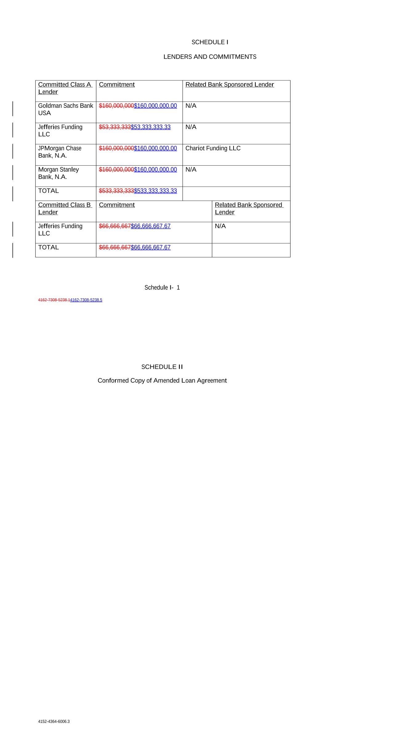 SCHEDULE I LENDERS AND COMMITMENTS Committed Class A Lender Commitment Related Bank Sponsored Lender Goldman Sachs Bank USA $160,000,000$160,000,000.00 N/A Jefferies Funding LLC $53,333,333$53,333,333.33 N/A JPMorgan Chase Bank, N.A. $160,000,000$160,000,000.00 Chariot Funding LLC Morgan Stanley Bank, N.A. $160,000,000$160,000,000.00 N/A TOTAL $533,333,333$533,333,333.33 Committed Class B Lender Commitment Related Bank Sponsored Lender Jefferies Funding LLC $66,666,667$66,666,667.67 N/A TOTAL $66,666,667$66,666,667.67 Schedule I- 1 4162-7308-5238.14162-7308-5238.5 4152-4364-6006.3 SCHEDULE II Conformed Copy of Amended Loan Agreement