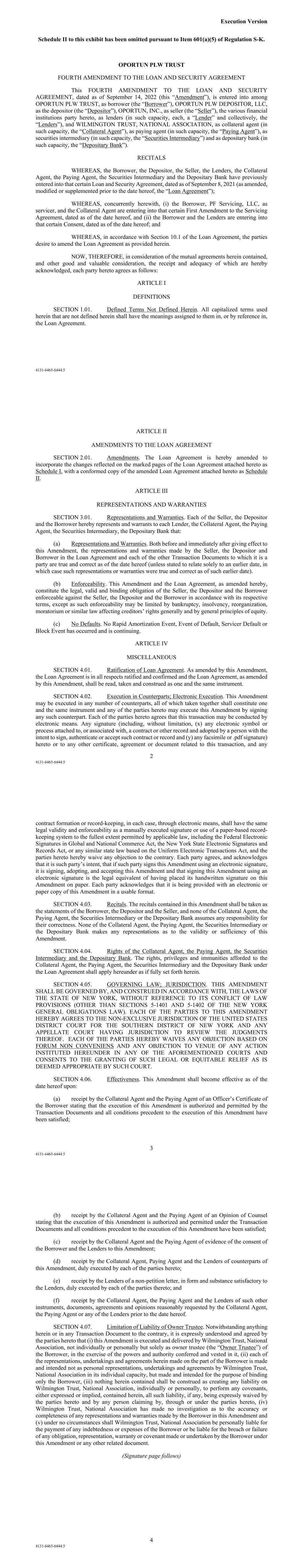 Execution Version 4131-6465-6444.5 Schedule II to this exhibit has been omitted pursuant to Item 601(a)(5) of Regulation S-K. OPORTUN PLW TRUST FOURTH AMENDMENT TO THE LOAN AND SECURITY AGREEMENT This FOURTH AMENDMENT TO THE LOAN AND SECURITY AGREEMENT, dated as of September 14, 2022 (this “Amendment”), is entered into among OPORTUN PLW TRUST, as borrower (the “Borrower”), OPORTUN PLW DEPOSITOR, LLC, as the depositor (the “Depositor”), OPORTUN, INC., as seller (the “Seller”), the various financial institutions party hereto, as lenders (in such capacity, each, a “Lender” and collectively, the “Lenders”), and WILMINGTON TRUST, NATIONAL ASSOCIATION, as collateral agent (in such capacity, the “Collateral Agent”), as paying agent (in such capacity, the “Paying Agent”), as securities intermediary (in such capacity, the “Securities Intermediary”) and as depositary bank (in such capacity, the “Depositary Bank”). RECITALS WHEREAS, the Borrower, the Depositor, the Seller, the Lenders, the Collateral Agent, the Paying Agent, the Securities Intermediary and the Depositary Bank have previously entered into that certain Loan and Security Agreement, dated as of September 8, 2021 (as amended, modified or supplemented prior to the date hereof, the “Loan Agreement”); WHEREAS, concurrently herewith, (i) the Borrower, PF Servicing, LLC, as servicer, and the Collateral Agent are entering into that certain First Amendment to the Servicing Agreement, dated as of the date hereof, and (ii) the Borrower and the Lenders are entering into that certain Consent, dated as of the date hereof; and WHEREAS, in accordance with Section 10.1 of the Loan Agreement, the parties desire to amend the Loan Agreement as provided herein. NOW, THEREFORE, in consideration of the mutual agreements herein contained, and other good and valuable consideration, the receipt and adequacy of which are hereby acknowledged, each party hereto agrees as follows: ARTICLE I DEFINITIONS SECTION 1.01. Defined Terms Not Defined Herein. All capitalized terms used herein that are not defined herein shall have the meanings assigned to them in, or by reference in, the Loan Agreement. 2 4131-6465-6444.5 ARTICLE II AMENDMENTS TO THE LOAN AGREEMENT SECTION 2.01. Amendments. The Loan Agreement is hereby amended to incorporate the changes reflected on the marked pages of the Loan Agreement attached hereto as Schedule I, with a conformed copy of the amended Loan Agreement attached hereto as Schedule II. ARTICLE III REPRESENTATIONS AND WARRANTIES SECTION 3.01. Representations and Warranties. Each of the Seller, the Depositor and the Borrower hereby represents and warrants to each Lender, the Collateral Agent, the Paying Agent, the Securities Intermediary, the Depositary Bank that: (a) Representations and Warranties. Both before and immediately after giving effect to this Amendment, the representations and warranties made by the Seller, the Depositor and Borrower in the Loan Agreement and each of the other Transaction Documents to which it is a party are true and correct as of the date hereof (unless stated to relate solely to an earlier date, in which case such representations or warranties were true and correct as of such earlier date). (b) Enforceability. This Amendment and the Loan Agreement, as amended hereby, constitute the legal, valid and binding obligation of the Seller, the Depositor and the Borrower enforceable against the Seller, the Depositor and the Borrower in accordance with its respective terms, except as such enforceability may be limited by bankruptcy, insolvency, reorganization, moratorium or similar law affecting creditors’ rights generally and by general principles of equity. (c) No Defaults. No Rapid Amortization Event, Event of Default, Servicer Default or Block Event has occurred and is continuing. ARTICLE IV MISCELLANEOUS SECTION 4.01. Ratification of Loan Agreement. As amended by this Amendment, the Loan Agreement is in all respects ratified and confirmed and the Loan Agreement, as amended by this Amendment, shall be read, taken and construed as one and the same instrument. SECTION 4.02. Execution in Counterparts; Electronic Execution. This Amendment may be executed in any number of counterparts, all of which taken together shall constitute one and the same instrument and any of the parties hereto may execute this Amendment by signing any such counterpart. Each of the parties hereto agrees that this transaction may be conducted by electronic means. Any signature (including, without limitation, (x) any electronic symbol or process attached to, or associated with, a contract or other record and adopted by a person with the intent to sign, authenticate or accept such contract or record and (y) any facsimile or .pdf signature) hereto or to any other certificate, agreement or document related to this transaction, and any 3 4131-6465-6444.5 contract formation or record-keeping, in each case, through electronic means, shall have the same legal validity and enforceability as a manually executed signature or use of a paper-based record- keeping system to the fullest extent permitted by applicable law, including the Federal Electronic Signatures in Global and National Commerce Act, the New York State Electronic Signatures and Records Act, or any similar state law based on the Uniform Electronic Transactions Act, and the parties hereto hereby waive any objection to the contrary. Each party agrees, and acknowledges that it is such party’s intent, that if such party signs this Amendment using an electronic signature, it is signing, adopting, and accepting this Amendment and that signing this Amendment using an electronic signature is the legal equivalent of having placed its handwritten signature on this Amendment on paper. Each party acknowledges that it is being provided with an electronic or paper copy of this Amendment in a usable format. SECTION 4.03. Recitals. The recitals contained in this Amen