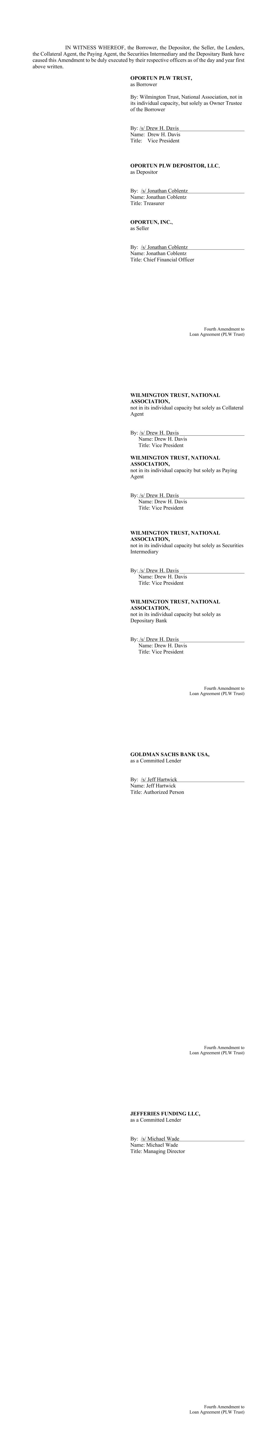 Fourth Amendment to Loan Agreement (PLW Trust) IN WITNESS WHEREOF, the Borrower, the Depositor, the Seller, the Lenders, the Collateral Agent, the Paying Agent, the Securities Intermediary and the Depositary Bank have caused this Amendment to be duly executed by their respective officers as of the day and year first above written. OPORTUN PLW TRUST, as Borrower By: Wilmington Trust, National Association, not in its individual capacity, but solely as Owner Trustee of the Borrower By: /s/ Drew H. Davis ________________________ Name: Drew H. Davis Title: Vice President OPORTUN PLW DEPOSITOR, LLC, as Depositor By: /s/ Jonathan Coblentz Name: Jonathan Coblentz Title: Treasurer OPORTUN, INC., as Seller By: /s/ Jonathan Coblentz Name: Jonathan Coblentz Title: Chief Financial Officer Fourth Amendment to Loan Agreement (PLW Trust) WILMINGTON TRUST, NATIONAL ASSOCIATION, not in its individual capacity but solely as Collateral Agent By: /s/ Drew H. Davis ________________________ Name: Drew H. Davis Title: Vice President WILMINGTON TRUST, NATIONAL ASSOCIATION, not in its individual capacity but solely as Paying Agent By: /s/ Drew H. Davis ________________________ Name: Drew H. Davis Title: Vice President WILMINGTON TRUST, NATIONAL ASSOCIATION, not in its individual capacity but solely as Securities Intermediary By: /s/ Drew H. Davis ________________________ Name: Drew H. Davis Title: Vice President WILMINGTON TRUST, NATIONAL ASSOCIATION, not in its individual capacity but solely as Depositary Bank By: /s/ Drew H. Davis ________________________ Name: Drew H. Davis Title: Vice President Fourth Amendment to Loan Agreement (PLW Trust) GOLDMAN SACHS BANK USA, as a Committed Lender By: /s/ Jeff Hartwick Name: Jeff Hartwick Title: Authorized Person Fourth Amendment to Loan Agreement (PLW Trust) JEFFERIES FUNDING LLC, as a Committed Lender By: /s/ Michael Wade Name: Michael Wade Title: Managing Director