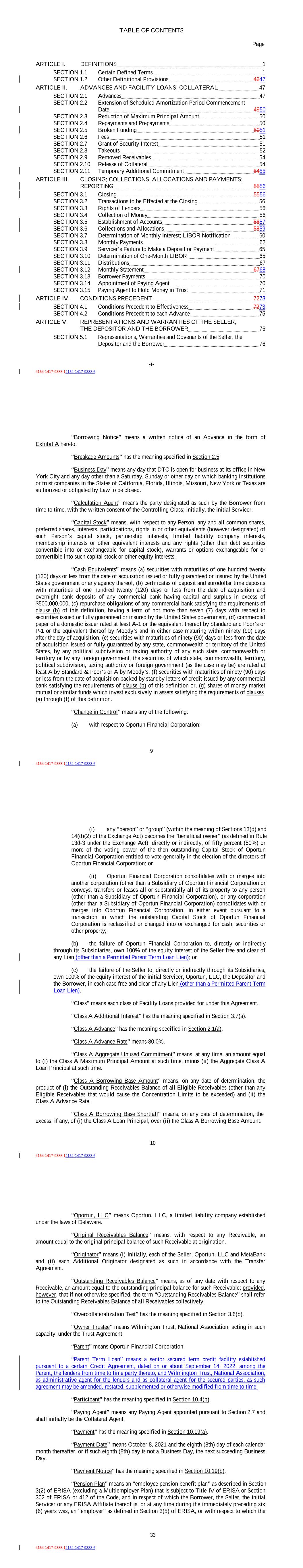 TABLE OF CONTENTS Page -i- 4154-1417-9388.14154-1417-9388.6 ARTICLE I. DEFINITIONS 1 SECTION 1.1 Certain Defined Terms 1 SECTION 1.2 Other Definitional Provisions 4647 ARTICLE II. ADVANCES AND FACILITY LOANS; COLLATERAL 47 SECTION 2.1 Advances 47 SECTION 2.2 Extension of Scheduled Amortization Period Commencement Date 4950 SECTION 2.3 Reduction of Maximum Principal Amount 50 SECTION 2.4 Repayments and Prepayments 50 SECTION 2.5 Broken Funding 5051 SECTION 2.6 Fees 51 SECTION 2.7 Grant of Security Interest 51 SECTION 2.8 Takeouts 52 SECTION 2.9 Removed Receivables 54 SECTION 2.10 Release of Collateral 54 SECTION 2.11 Temporary Additional Commitment 5455 ARTICLE III. CLOSING; COLLECTIONS, ALLOCATIONS AND PAYMENTS; REPORTING 5556 SECTION 3.1 Closing 5556 SECTION 3.2 Transactions to be Effected at the Closing 56 SECTION 3.3 Rights of Lenders 56 SECTION 3.4 Collection of Money 56 SECTION 3.5 Establishment of Accounts 5657 SECTION 3.6 Collections and Allocations 5859 SECTION 3.7 Determination of Monthly Interest; LIBOR Notification 60 SECTION 3.8 Monthly Payments 62 SECTION 3.9 Servicer’s Failure to Make a Deposit or Payment 65 SECTION 3.10 Determination of One-Month LIBOR 65 SECTION 3.11 Distributions 67 SECTION 3.12 Monthly Statement 6768 SECTION 3.13 Borrower Payments 70 SECTION 3.14 Appointment of Paying Agent 70 SECTION 3.15 Paying Agent to Hold Money in Trust 71 ARTICLE IV. CONDITIONS PRECEDENT 7273 SECTION 4.1 Conditions Precedent to Effectiveness 7273 SECTION 4.2 Conditions Precedent to each Advance 75 ARTICLE V. REPRESENTATIONS AND WARRANTIES OF THE SELLER, THE DEPOSITOR AND THE BORROWER 76 SECTION 5.1 Representations, Warranties and Covenants of the Seller, the Depositor and the Borrower 76 9 4154-1417-9388.14154-1417-9388.6 “Borrowing Notice” means a written notice of an Advance in the form of Exhibit A hereto. “Breakage Amounts” has the meaning specified in Section 2.5. “Business Day” means any day that DTC is open for business at its office in New York City and any day other than a Saturday, Sunday or other day on which banking institutions or trust companies in the States of California, Florida, Illinois, Missouri, New York or Texas are authorized or obligated by Law to be closed. “Calculation Agent” means the party designated as such by the Borrower from time to time, with the written consent of the Controlling Class; initially, the initial Servicer. “Capital Stock” means, with respect to any Person, any and all common shares, preferred shares, interests, participations, rights in or other equivalents (however designated) of such Person’s capital stock, partnership interests, limited liability company interests, membership interests or other equivalent interests and any rights (other than debt securities convertible into or exchangeable for capital stock), warrants or options exchangeable for or convertible into such capital stock or other equity interests. “Cash Equivalents” means (a) securities with maturities of one hundred twenty (120) days or less from the date of acquisition issued or fully guaranteed or insured by the United States government or any agency thereof, (b) certificates of deposit and eurodollar time deposits with maturities of one hundred twenty (120) days or less from the date of acquisition and overnight bank deposits of any commercial bank having capital and surplus in excess of $500,000,000, (c) repurchase obligations of any commercial bank satisfying the requirements of clause (b) of this definition, having a term of not more than seven (7) days with respect to securities issued or fully guaranteed or insured by the United States government, (d) commercial paper of a domestic issuer rated at least A-1 or the equivalent thereof by Standard and Poor’s or P-1 or the equivalent thereof by Moody’s and in either case maturing within ninety (90) days after the day of acquisition, (e) securities with maturities of ninety (90) days or less from the date of acquisition issued or fully guaranteed by any state, commonwealth or territory of the United States, by any political subdivision or taxing authority of any such state, commonwealth or territory or by any foreign government, the securities of which state, commonwealth, territory, political subdivision, taxing authority or foreign government (as the case may be) are rated at least A by Standard & Poor’s or A by Moody’s, (f) securities with maturities of ninety (90) days or less from the date of acquisition backed by standby letters of credit issued by any commercial bank satisfying the requirements of clause (b) of this definition or, (g) shares of money market mutual or similar funds which invest exclusively in assets satisfying the requirements of clauses (a) through (f) of this definition. “Change in Control” means any of the following: (a) with respect to Oportun Financial Corporation: 10 4154-1417-9388.14154-1417-9388.6 (i) any “person” or “group” (within the meaning of Sections 13(d) and 14(d)(2) of the Exchange Act) becomes the “beneficial owner” (as defined in Rule 13d-3 under the Exchange Act), directly or indirectly, of fifty percent (50%) or more of the voting power of the then outstanding Capital Stock of Oportun Financial Corporation entitled to vote generally in the election of the directors of Oportun Financial Corporation; or (ii) Oportun Financial Corporation consolidates with or merges into another corporation (other than a Subsidiary of Oportun Financial Corporation or conveys, transfers or leases all or substantially all of its property to any person (other than a Subsidiary of Oportun Financial Corporation), or any corporation (other than a Subsidiary of Oportun Financial Corporation) consolidates with or merges into Oportun Financial Corporation, in either event pursuant to a transaction in which the outstanding Capital Stock of Oportun Financial Corporation is reclassified or changed into or exchanged for cash, securities or other propert