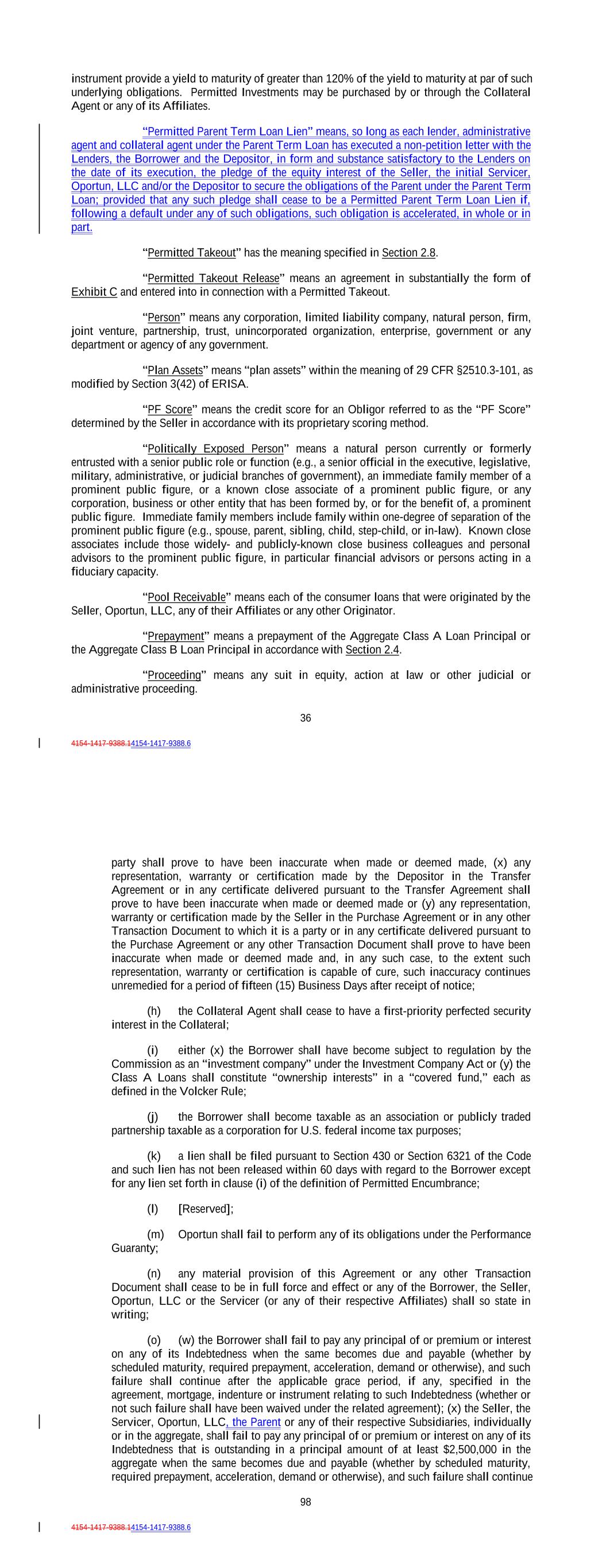 36 4154-1417-9388.14154-1417-9388.6 instrument provide a yield to maturity of greater than 120% of the yield to maturity at par of such underlying obligations. Permitted Investments may be purchased by or through the Collateral Agent or any of its Affiliates. “Permitted Parent Term Loan Lien” means, so long as each lender, administrative agent and collateral agent under the Parent Term Loan has executed a non-petition letter with the Lenders, the Borrower and the Depositor, in form and substance satisfactory to the Lenders on the date of its execution, the pledge of the equity interest of the Seller, the initial Servicer, Oportun, LLC and/or the Depositor to secure the obligations of the Parent under the Parent Term Loan; provided that any such pledge shall cease to be a Permitted Parent Term Loan Lien if, following a default under any of such obligations, such obligation is accelerated, in whole or in part. “Permitted Takeout” has the meaning specified in Section 2.8. “Permitted Takeout Release” means an agreement in substantially the form of Exhibit C and entered into in connection with a Permitted Takeout. “Person” means any corporation, limited liability company, natural person, firm, joint venture, partnership, trust, unincorporated organization, enterprise, government or any department or agency of any government. “Plan Assets” means “plan assets” within the meaning of 29 CFR §2510.3-101, as modified by Section 3(42) of ERISA. “PF Score” means the credit score for an Obligor referred to as the “PF Score” determined by the Seller in accordance with its proprietary scoring method. “Politically Exposed Person” means a natural person currently or formerly entrusted with a senior public role or function (e.g., a senior official in the executive, legislative, military, administrative, or judicial branches of government), an immediate family member of a prominent public figure, or a known close associate of a prominent public figure, or any corporation, business or other entity that has been formed by, or for the benefit of, a prominent public figure. Immediate family members include family within one-degree of separation of the prominent public figure (e.g., spouse, parent, sibling, child, step-child, or in-law). Known close associates include those widely- and publicly-known close business colleagues and personal advisors to the prominent public figure, in particular financial advisors or persons acting in a fiduciary capacity. “Pool Receivable” means each of the consumer loans that were originated by the Seller, Oportun, LLC, any of their Affiliates or any other Originator. “Prepayment” means a prepayment of the Aggregate Class A Loan Principal or the Aggregate Class B Loan Principal in accordance with Section 2.4. “Proceeding” means any suit in equity, action at law or other judicial or administrative proceeding. 98 4154-1417-9388.14154-1417-9388.6 party shall prove to have been inaccurate when made or deemed made, (x) any representation, warranty or certification made by the Depositor in the Transfer Agreement or in any certificate delivered pursuant to the Transfer Agreement shall prove to have been inaccurate when made or deemed made or (y) any representation, warranty or certification made by the Seller in the Purchase Agreement or in any other Transaction Document to which it is a party or in any certificate delivered pursuant to the Purchase Agreement or any other Transaction Document shall prove to have been inaccurate when made or deemed made and, in any such case, to the extent such representation, warranty or certification is capable of cure, such inaccuracy continues unremedied for a period of fifteen (15) Business Days after receipt of notice; (h) the Collateral Agent shall cease to have a first-priority perfected security interest in the Collateral; (i) either (x) the Borrower shall have become subject to regulation by the Commission as an “investment company” under the Investment Company Act or (y) the Class A Loans shall constitute “ownership interests” in a “covered fund,” each as defined in the Volcker Rule; (j) the Borrower shall become taxable as an association or publicly traded partnership taxable as a corporation for U.S. federal income tax purposes; (k) a lien shall be filed pursuant to Section 430 or Section 6321 of the Code and such lien has not been released within 60 days with regard to the Borrower except for any lien set forth in clause (i) of the definition of Permitted Encumbrance; (l) [Reserved]; (m) Oportun shall fail to perform any of its obligations under the Performance Guaranty; (n) any material provision of this Agreement or any other Transaction Document shall cease to be in full force and effect or any of the Borrower, the Seller, Oportun, LLC or the Servicer (or any of their respective Affiliates) shall so state in writing; (o) (w) the Borrower shall fail to pay any principal of or premium or interest on any of its Indebtedness when the same becomes due and payable (whether by scheduled maturity, required prepayment, acceleration, demand or otherwise), and such failure shall continue after the applicable grace period, if any, specified in the agreement, mortgage, indenture or instrument relating to such Indebtedness (whether or not such failure shall have been waived under the related agreement); (x) the Seller, the Servicer, Oportun, LLC, the Parent or any of their respective Subsidiaries, individually or in the aggregate, shall fail to pay any principal of or premium or interest on any of its Indebtedness that is outstanding in a principal amount of at least $2,500,000 in the aggregate when the same becomes due and payable (whether by scheduled maturity, required prepayment, acceleration, demand or otherwise), and such failure shall continue