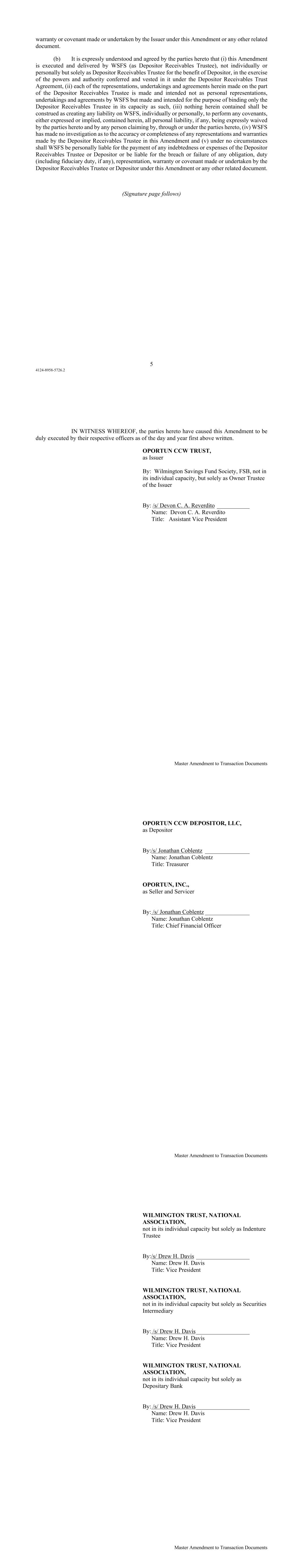 5 4124-8958-5726.2 warranty or covenant made or undertaken by the Issuer under this Amendment or any other related document. (b) It is expressly understood and agreed by the parties hereto that (i) this Amendment is executed and delivered by WSFS (as Depositor Receivables Trustee), not individually or personally but solely as Depositor Receivables Trustee for the benefit of Depositor, in the exercise of the powers and authority conferred and vested in it under the Depositor Receivables Trust Agreement, (ii) each of the representations, undertakings and agreements herein made on the part of the Depositor Receivables Trustee is made and intended not as personal representations, undertakings and agreements by WSFS but made and intended for the purpose of binding only the Depositor Receivables Trustee in its capacity as such, (iii) nothing herein contained shall be construed as creating any liability on WSFS, individually or personally, to perform any covenants, either expressed or implied, contained herein, all personal liability, if any, being expressly waived by the parties hereto and by any person claiming by, through or under the parties hereto, (iv) WSFS has made no investigation as to the accuracy or completeness of any representations and warranties made by the Depositor Receivables Trustee in this Amendment and (v) under no circumstances shall WSFS be personally liable for the payment of any indebtedness or expenses of the Depositor Receivables Trustee or Depositor or be liable for the breach or failure of any obligation, duty (including fiduciary duty, if any), representation, warranty or covenant made or undertaken by the Depositor Receivables Trustee or Depositor under this Amendment or any other related document. (Signature page follows) Master Amendment to Transaction Documents IN WITNESS WHEREOF, the parties hereto have caused this Amendment to be duly executed by their respective officers as of the day and year first above written. OPORTUN CCW TRUST, as Issuer By: Wilmington Savings Fund Society, FSB, not in its individual capacity, but solely as Owner Trustee of the Issuer By: /s/ Devon C. A. Reverdito ___________ Name: Devon C. A. Reverdito Title: Assistant Vice President Master Amendment to Transaction Documents OPORTUN CCW DEPOSITOR, LLC, as Depositor By:/s/ Jonathan Coblentz _______________ Name: Jonathan Coblentz Title: Treasurer OPORTUN, INC., as Seller and Servicer By: /s/ Jonathan Coblentz _______________ Name: Jonathan Coblentz Title: Chief Financial Officer Master Amendment to Transaction Documents WILMINGTON TRUST, NATIONAL ASSOCIATION, not in its individual capacity but solely as Indenture Trustee By:/s/ Drew H. Davis __________________ Name: Drew H. Davis Title: Vice President WILMINGTON TRUST, NATIONAL ASSOCIATION, not in its individual capacity but solely as Securities Intermediary By: /s/ Drew H. Davis __________________ Name: Drew H. Davis Title: Vice President WILMINGTON TRUST, NATIONAL ASSOCIATION, not in its individual capacity but solely as Depositary Bank By: /s/ Drew H. Davis __________________ Name: Drew H. Davis Title: Vice President