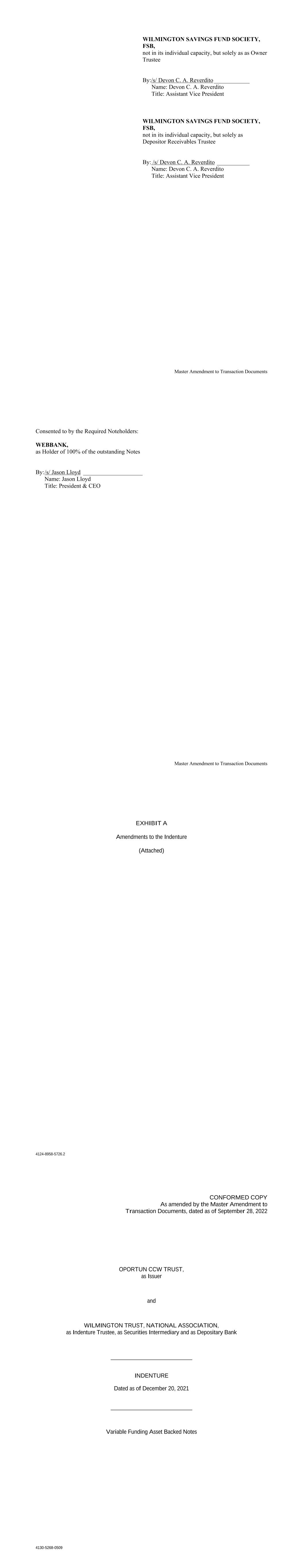 Master Amendment to Transaction Documents WILMINGTON SAVINGS FUND SOCIETY, FSB, not in its individual capacity, but solely as as Owner Trustee By:/s/ Devon C. A. Reverdito ____________ Name: Devon C. A. Reverdito Title: Assistant Vice President WILMINGTON SAVINGS FUND SOCIETY, FSB, not in its individual capacity, but solely as Depositor Receivables Trustee By: /s/ Devon C. A. Reverdito ___________ Name: Devon C. A. Reverdito Title: Assistant Vice President Master Amendment to Transaction Documents Consented to by the Required Noteholders: WEBBANK, as Holder of 100% of the outstanding Notes By: /s/ Jason Lloyd ____________________ Name: Jason Lloyd Title: President & CEO 4124-8958-5726.2 EXHIBIT A Amendments to the Indenture (Attached) CONFORMED COPY As amended by the Master Amendment to Transaction Documents, dated as of September 28, 2022 4130-5268-0509 OPORTUN CCW TRUST, as Issuer and WILMINGTON TRUST, NATIONAL ASSOCIATION, as Indenture Trustee, as Securities Intermediary and as Depositary Bank INDENTURE Dated as of December 20, 2021 Variable Funding Asset Backed Notes