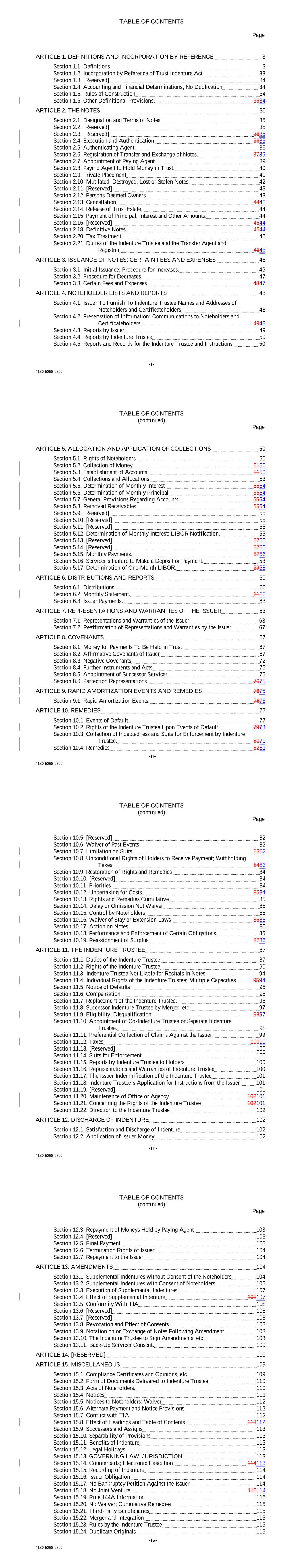 TABLE OF CONTENTS Page -i- 4130-5268-0509 ARTICLE 1. DEFINITIONS AND INCORPORATION BY REFERENCE 3 Section 1.1. Definitions 3 Section 1.2. Incorporation by Reference of Trust Indenture Act 33 Section 1.3. [Reserved] 34 Section 1.4. Accounting and Financial Determinations; No Duplication 34 Section 1.5. Rules of Construction 34 Section 1.6. Other Definitional Provisions. 3534 ARTICLE 2. THE NOTES 35 Section 2.1. Designation and Terms of Notes 35 Section 2.2. [Reserved] 35 Section 2.3. [Reserved]. 3635 Section 2.4. Execution and Authentication. 3635 Section 2.5. Authenticating Agent. 36 Section 2.6. Registration of Transfer and Exchange of Notes. 3736 Section 2.7. Appointment of Paying Agent 39 Section 2.8. Paying Agent to Hold Money in Trust. 40 Section 2.9. Private Placement 41 Section 2.10. Mutilated, Destroyed, Lost or Stolen Notes. 42 Section 2.11. [Reserved]. 43 Section 2.12. Persons Deemed Owners 43 Section 2.13. Cancellation 4443 Section 2.14. Release of Trust Estate 44 Section 2.15. Payment of Principal, Interest and Other Amounts. 44 Section 2.16. [Reserved]. 4544 Section 2.18. Definitive Notes. 4544 Section 2.20. Tax Treatment 45 Section 2.21. Duties of the Indenture Trustee and the Transfer Agent and Registrar 4645 ARTICLE 3. ISSUANCE OF NOTES; CERTAIN FEES AND EXPENSES 46 Section 3.1. Initial Issuance; Procedure for Increases. 46 Section 3.2. Procedure for Decreases. 47 Section 3.3. Certain Fees and Expenses.. 4847 ARTICLE 4. NOTEHOLDER LISTS AND REPORTS 48 Section 4.1. Issuer To Furnish To Indenture Trustee Names and Addresses of Noteholders and Certificateholders 48 Section 4.2. Preservation of Information; Communications to Noteholders and Certificateholders. 4948 Section 4.3. Reports by Issuer 49 Section 4.4. Reports by Indenture Trustee 50 Section 4.5. Reports and Records for the Indenture Trustee and Instructions. 50 TABLE OF CONTENTS (continued) Page -ii- 4130-5268-0509 ARTICLE 5. ALLOCATION AND APPLICATION OF COLLECTIONS 50 Section 5.1. Rights of Noteholders 50 Section 5.2. Collection of Money 5150 Section 5.3. Establishment of Accounts. 5150 Section 5.4. Collections and Allocations. 53 Section 5.5. Determination of Monthly Interest 5554 Section 5.6. Determination of Monthly Principal 5554 Section 5.7. General Provisions Regarding Accounts 5554 Section 5.8. Removed Receivables 5554 Section 5.9. [Reserved]. 55 Section 5.10. [Reserved]. 55 Section 5.11. [Reserved]. 55 Section 5.12. Determination of Monthly Interest; LIBOR Notification. 55 Section 5.13. [Reserved]. 5756 Section 5.14. [Reserved]. 5756 Section 5.15. Monthly Payments. 5756 Section 5.16. Servicer’s Failure to Make a Deposit or Payment. 58 Section 5.17. Determination of One-Month LIBOR. 5958 ARTICLE 6. DISTRIBUTIONS AND REPORTS 60 Section 6.1. Distributions. 60 Section 6.2. Monthly Statement. 6160 Section 6.3. Issuer Payments. 63 ARTICLE 7. REPRESENTATIONS AND WARRANTIES OF THE ISSUER 63 Section 7.1. Representations and Warranties of the Issuer. 63 Section 7.2. Reaffirmation of Representations and Warranties by the Issuer. 67 ARTICLE 8. COVENANTS 67 Section 8.1. Money for Payments To Be Held in Trust 67 Section 8.2. Affirmative Covenants of Issuer 67 Section 8.3. Negative Covenants 72 Section 8.4. Further Instruments and Acts 75 Section 8.5. Appointment of Successor Servicer 75 Section 8.6. Perfection Representations 7675 ARTICLE 9. RAPID AMORTIZATION EVENTS AND REMEDIES 7675 Section 9.1. Rapid Amortization Events. 7675 ARTICLE 10. REMEDIES 77 Section 10.1. Events of Default 77 Section 10.2. Rights of the Indenture Trustee Upon Events of Default. 7978 Section 10.3. Collection of Indebtedness and Suits for Enforcement by Indenture Trustee. 8079 Section 10.4. Remedies 8281 TABLE OF CONTENTS (continued) Page -iii- 4130-5268-0509 Section 10.5. [Reserved]. 82 Section 10.6. Waiver of Past Events 82 Section 10.7. Limitation on Suits 8382 Section 10.8. Unconditional Rights of Holders to Receive Payment; Withholding Taxes. 8483 Section 10.9. Restoration of Rights and Remedies 84 Section 10.10. [Reserved] 84 Section 10.11. Priorities 84 Section 10.12. Undertaking for Costs 8584 Section 10.13. Rights and Remedies Cumulative 85 Section 10.14. Delay or Omission Not Waiver 85 Section 10.15. Control by Noteholders 85 Section 10.16. Waiver of Stay or Extension Laws 8685 Section 10.17. Action on Notes 86 Section 10.18. Performance and Enforcement of Certain Obligations. 86 Section 10.19. Reassignment of Surplus 8786 ARTICLE 11. THE INDENTURE TRUSTEE 87 Section 11.1. Duties of the Indenture Trustee. 87 Section 11.2. Rights of the Indenture Trustee 90 Section 11.3. Indenture Trustee Not Liable for Recitals in Notes 94 Section 11.4. Individual Rights of the Indenture Trustee; Multiple Capacities 9594 Section 11.5. Notice of Defaults 95 Section 11.6. Compensation. 95 Section 11.7. Replacement of the Indenture Trustee. 96 Section 11.8. Successor Indenture Trustee by Merger, etc. 97 Section 11.9. Eligibility: Disqualification 9897 Section 11.10. Appointment of Co-Indenture Trustee or Separate Indenture Trustee. 98 Section 11.11. Preferential Collection of Claims Against the Issuer 99 Section 11.12. Taxes 10099 Section 11.13. [Reserved] 100 Section 11.14. Suits for Enforcement 100 Section 11.15. Reports by Indenture Trustee to Holders 100 Section 11.16. Representations and Warranties of Indenture Trustee 100 Section 11.17. The Issuer Indemnification of the Indenture Trustee 101 Section 11.18. Indenture Trustee’s Application for Instructions from the Issuer 101 Section 11.19. [Reserved]. 101 Section 11.20. Maintenance of Office or Agency 102101 Section 11.21. Concerning the Rights of the Indenture Trustee 102101 Section 11.22. Direction to the Indenture Trustee 102 ARTICLE 12. DISCHARGE OF INDENTURE 102 Section 12.1. Satisfaction and Discharge of Indenture 102 Section 12.2. Application of Issuer Money 102 TABLE OF CONTENTS (continued) Page -iv- 4130-5268-0509 Section 12.3. Repayment of Moneys Held by Paying Agent 103 Section 12.4. 