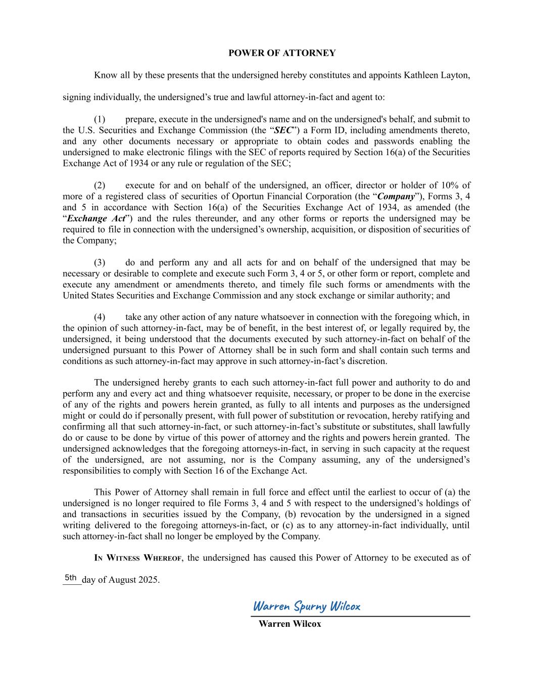 POWER OF ATTORNEY Know all by these presents that the undersigned hereby constitutes and appoints Kathleen Layton, signing individually, the undersigned’s true and lawful attorney-in-fact and agent to: (1) prepare, execute in the undersigned's name and on the undersigned's behalf, and submit to the U.S. Securities and Exchange Commission (the “SEC”) a Form ID, including amendments thereto, and any other documents necessary or appropriate to obtain codes and passwords enabling the undersigned to make electronic filings with the SEC of reports required by Section 16(a) of the Securities Exchange Act of 1934 or any rule or regulation of the SEC; (2) execute for and on behalf of the undersigned, an officer, director or holder of 10% of more of a registered class of securities of Oportun Financial Corporation (the “Company”), Forms 3, 4 and 5 in accordance with Section 16(a) of the Securities Exchange Act of 1934, as amended (the “Exchange Act”) and the rules thereunder, and any other forms or reports the undersigned may be required to file in connection with the undersigned’s ownership, acquisition, or disposition of securities of the Company; (3) do and perform any and all acts for and on behalf of the undersigned that may be necessary or desirable to complete and execute such Form 3, 4 or 5, or other form or report, complete and execute any amendment or amendments thereto, and timely file such forms or amendments with the United States Securities and Exchange Commission and any stock exchange or similar authority; and (4) take any other action of any nature whatsoever in connection with the foregoing which, in the opinion of such attorney-in-fact, may be of benefit, in the best interest of, or legally required by, the undersigned, it being understood that the documents executed by such attorney-in-fact on behalf of the undersigned pursuant to this Power of Attorney shall be in such form and shall contain such terms and conditions as such attorney-in-fact may approve in such attorney-in-fact’s discretion. The undersigned hereby grants to each such attorney-in-fact full power and authority to do and perform any and every act and thing whatsoever requisite, necessary, or proper to be done in the exercise of any of the rights and powers herein granted, as fully to all intents and purposes as the undersigned might or could do if personally present, with full power of substitution or revocation, hereby ratifying and confirming all that such attorney-in-fact, or such attorney-in-fact’s substitute or substitutes, shall lawfully do or cause to be done by virtue of this power of attorney and the rights and powers herein granted. The undersigned acknowledges that the foregoing attorneys-in-fact, in serving in such capacity at the request of the undersigned, are not assuming, nor is the Company assuming, any of the undersigned’s responsibilities to comply with Section 16 of the Exchange Act. This Power of Attorney shall remain in full force and effect until the earliest to occur of (a) the undersigned is no longer required to file Forms 3, 4 and 5 with respect to the undersigned’s holdings of and transactions in securities issued by the Company, (b) revocation by the undersigned in a signed writing delivered to the foregoing attorneys-in-fact, or (c) as to any attorney-in-fact individually, until such attorney-in-fact shall no longer be employed by the Company. IN WITNESS WHEREOF, the undersigned has caused this Power of Attorney to be executed as of ____day of August 2025. Warren Wilcox 5th