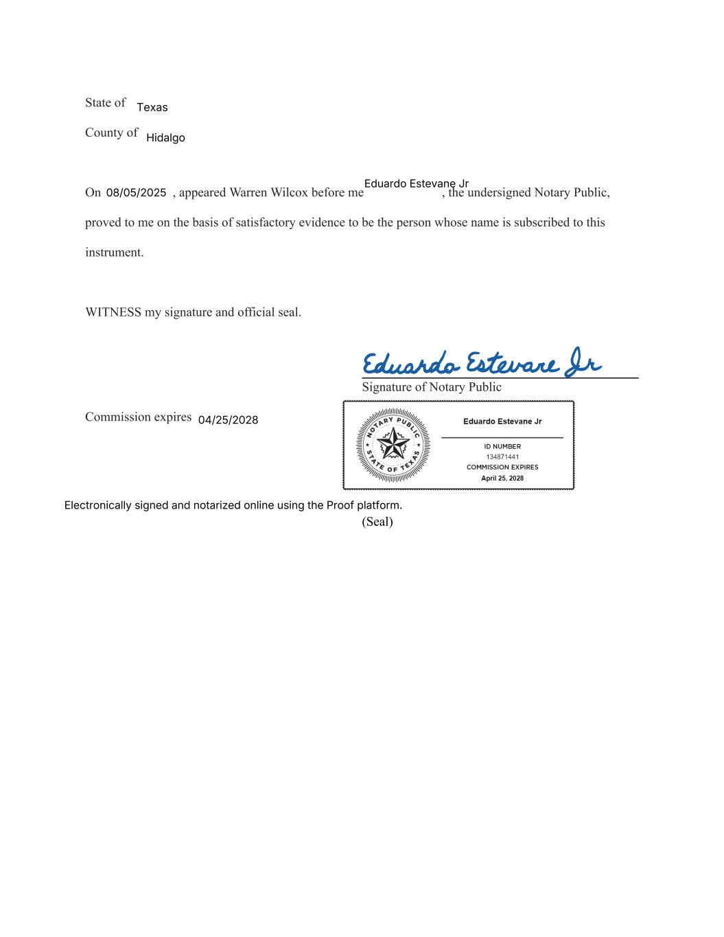 State of County of On , appeared Warren Wilcox before me , the undersigned Notary Public, proved to me on the basis of satisfactory evidence to be the person whose name is subscribed to this instrument. WITNESS my signature and official seal. Signature of Notary Public Commission expires (Seal) Texas Hidalgo 08/05/2025 Eduardo Estevane Jr 04/25/2028 Electronically signed and notarized online using the Proof platform.